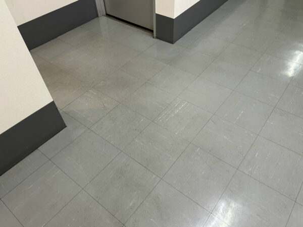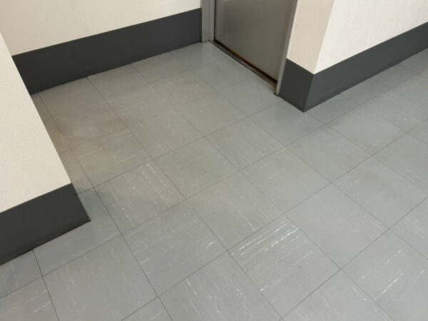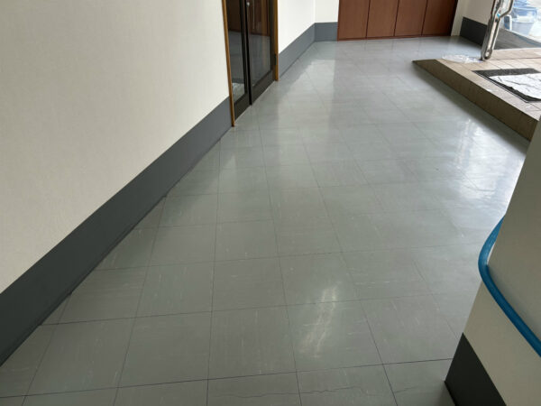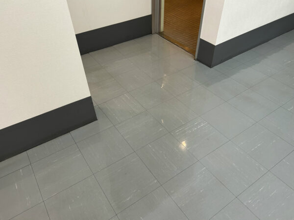 歩行量が多い北側玄関側の痛みが激しいです。ワックスの層が薄いのはいいことなのですが、擦り傷がPタイル表面に達してしまうことがあり、今後の課題です。