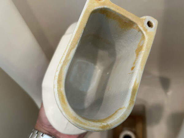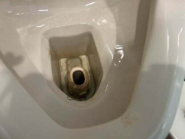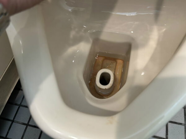 普段なら塩酸系のトイレ洗剤できれいに落ちるのですが、石灰化した付着物が残りました。刃物で削る手もあるのですが、洗剤の力だけで落とすほうが良いので次回の宿題にしました。