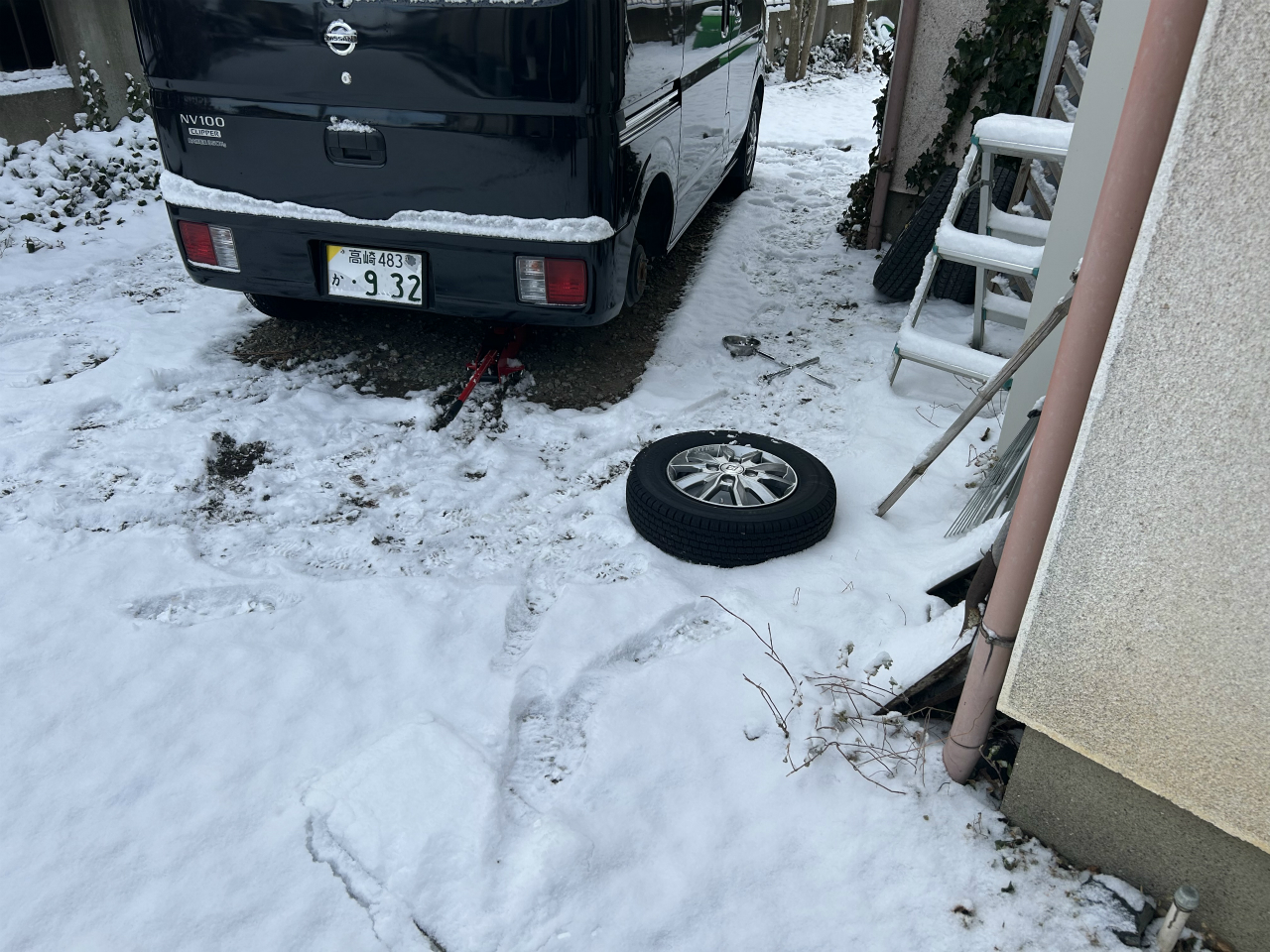 朝ご飯を食べてから、早速タイヤ交換。軽バン1台なら、30分かからずに交換できます。最後の右後輪を作業中。ジャッキアップポイントは、前輪ならサイドシルを使えるそうですが、僕は前も後ろももっと丈夫な場所を使います。後輪はアクスルハウジングにポコッと膨れた受け位置があります。(一昨年冬、後輪を替えようとしてサイドシルに当てて持ち上げたら変形しました。荷室が空なら何とかなるかもしれませんが、満載状態ですので、無理があるのだと思います)。