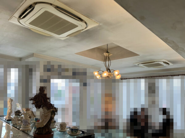 前橋市で洋菓子店を営んでおられるI様から、先月初めにエアコンクリーニングの注文がありました。昨年末に工房、6月末にリビングのご注文を受けました。今回は店舗に設置の天井埋め2台ということです。