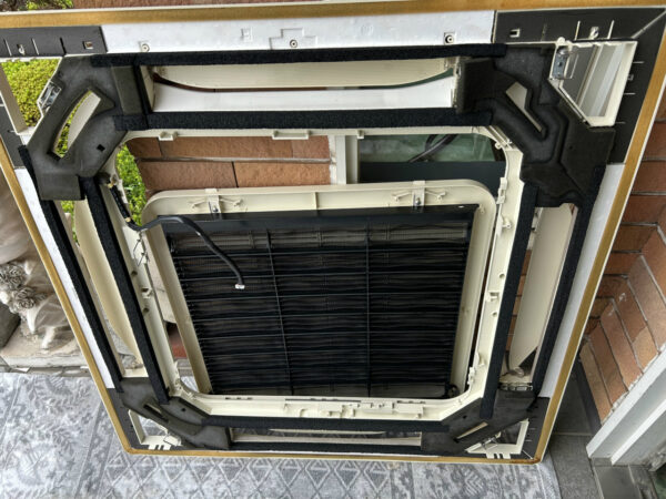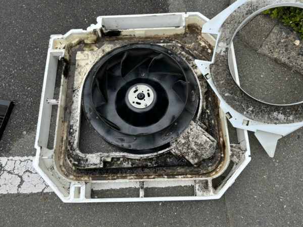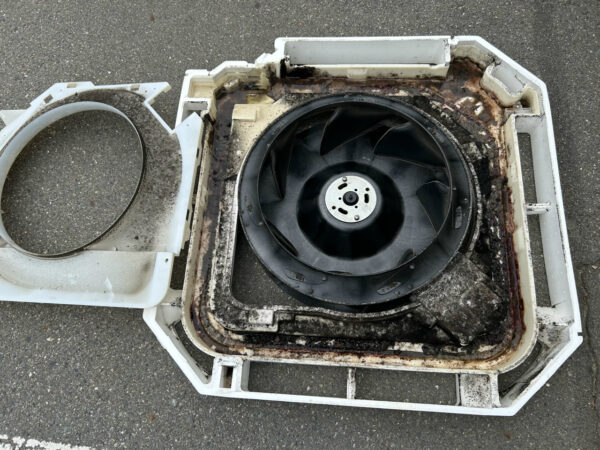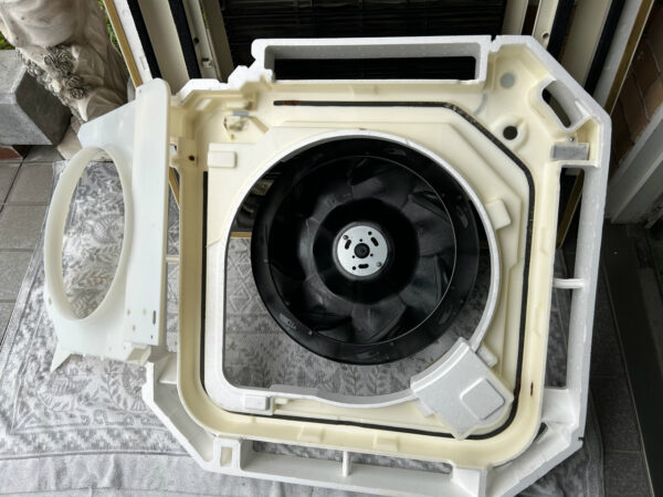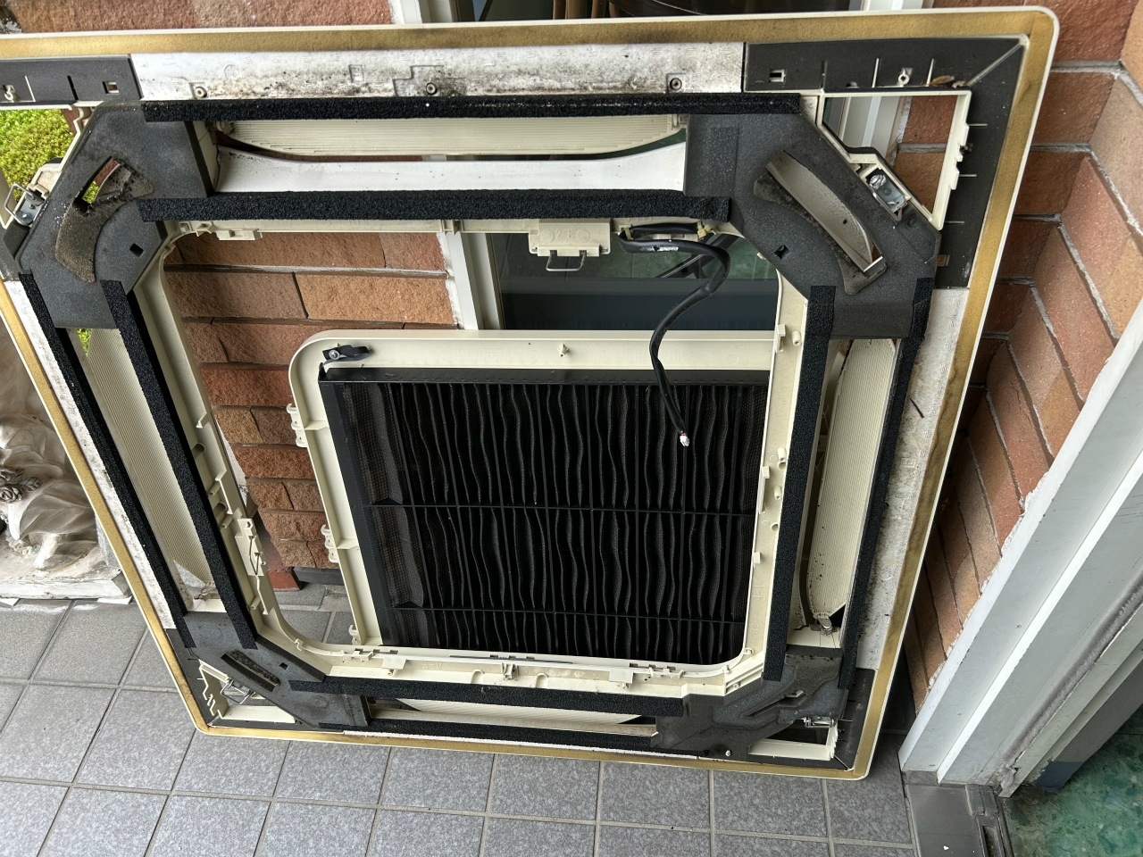 天井化粧板とグリル。化粧板から上下羽用のモーターを外して丸洗いします。送風経路や羽に付着したカビを洗い流します。