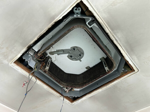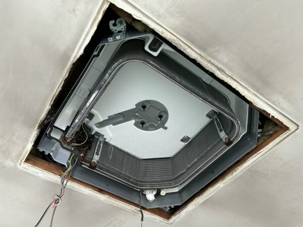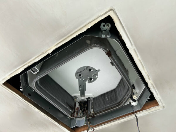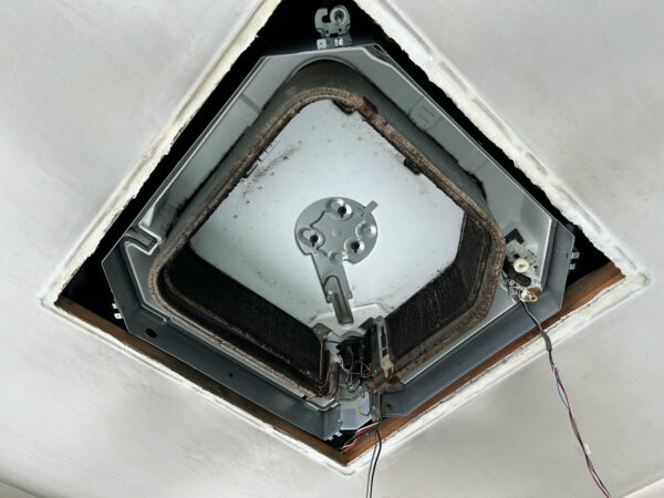 その下を何度も往復したのに、どんなエアコンだったか覚えていません。写真を送っていただくと、工房と同じころのダイキンラウンドフローです。下見なしですが、天井埋め2台分、複数台値引きは無しでお見積りしました。
