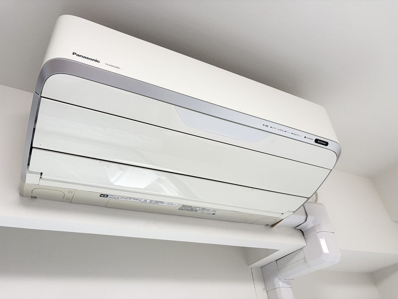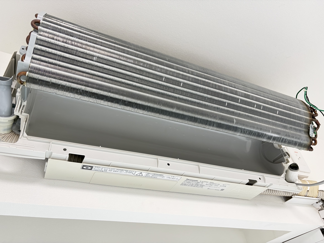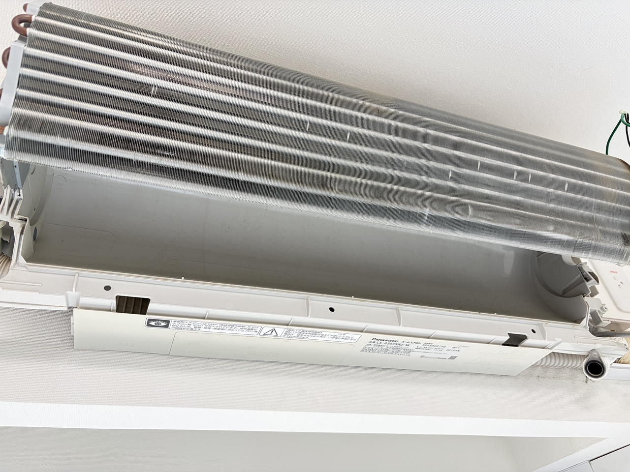 H様のご注文でパナソニックのお掃除機能付きエアコンを洗いました。CS-635CXR2-W、パナソニック2015年製です。2015年は室内機デザインが移行した時期で、これは新デザイン、とても手前に張り出した形状になりました。前回洗ったのは2018年8月で、2回目のクリーニングです。