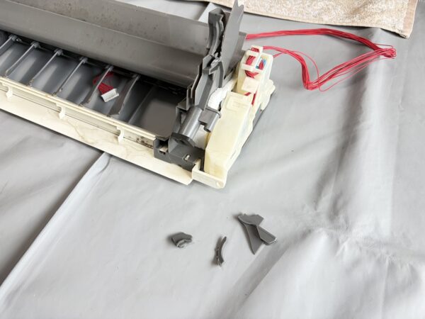 分解を始めて、お掃除ロボットの蛇腹受けの部分を外したとき、左側にグレーの破片が落ちました。どこから落ちたのかわからなかったのですが、ドレンパンを外すとき、さらにパラパラと3つくらい落ちました。複雑骨折です。