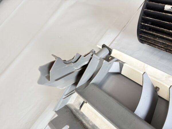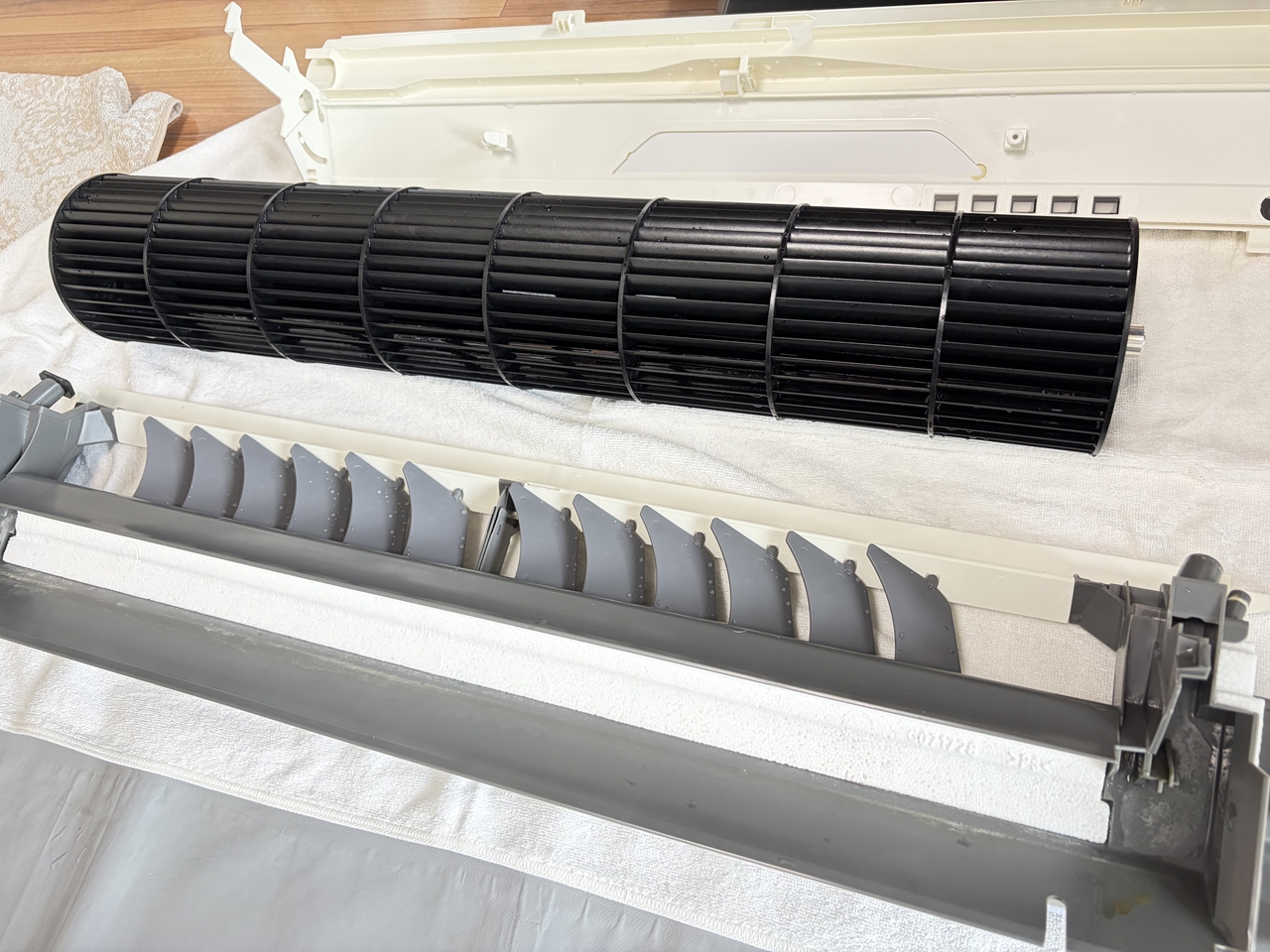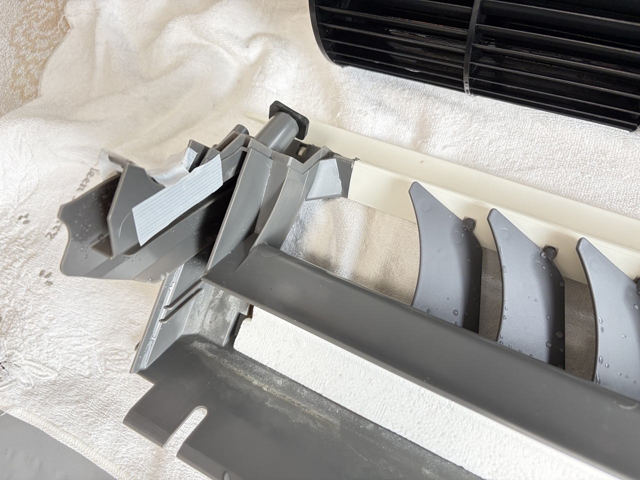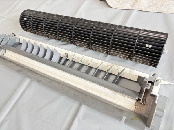 当店はこれで2回目の経験です。2年ほど前、やはりパナソニックお掃除エアコン2015年製でした。その時は立ち上がっている部分が根元から折れていて、部品交換が必要でした。これは、エアコンを洗っているお掃除屋さんと共有している事例で、何かしらの化学反応で樹脂パーツが脆くなっていて、分解作業中に破損するというものです。