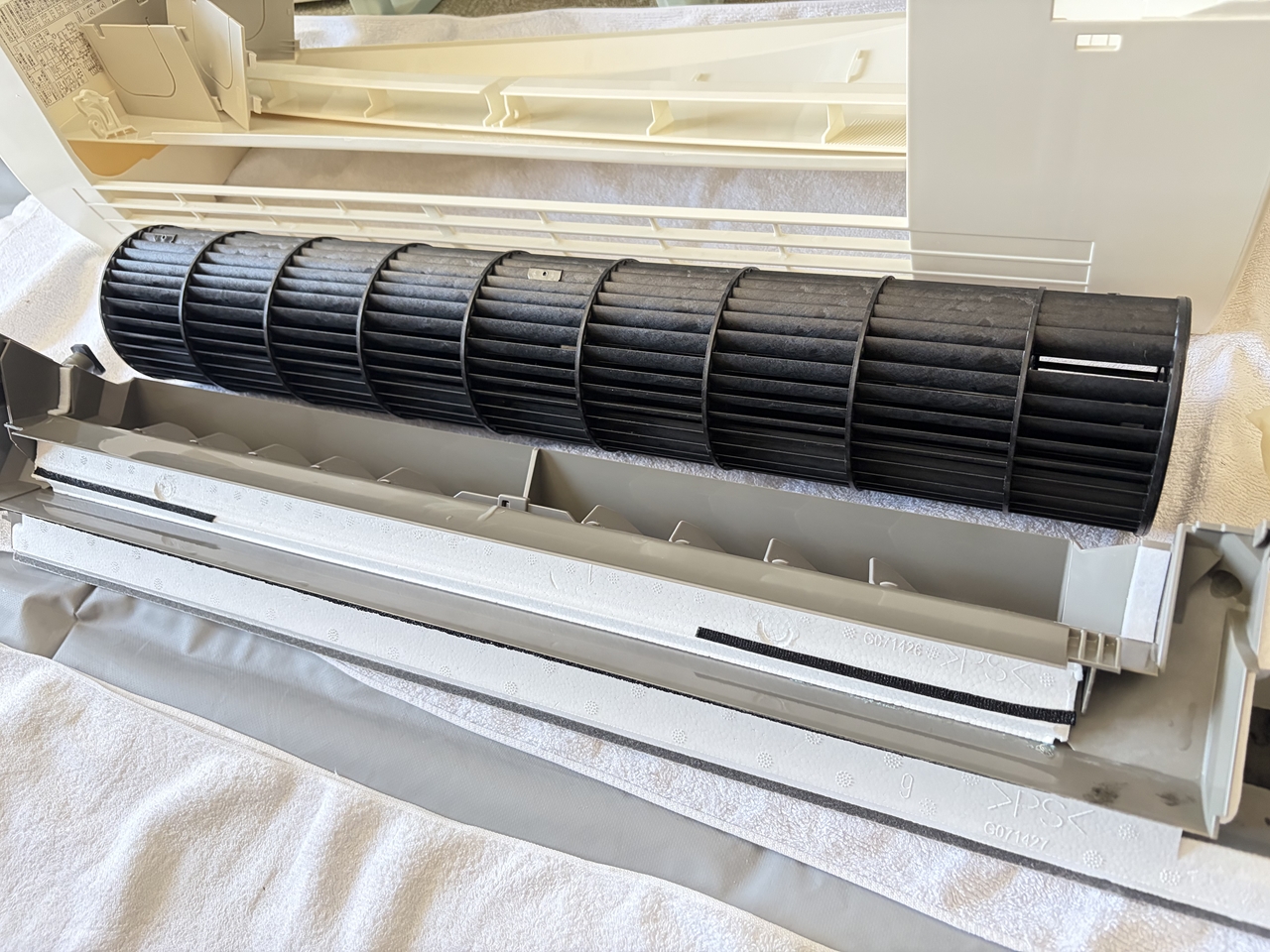 普段だと外したパーツはすべて弟が洗ってくれますが、今日は自分で洗わなければなりません。そこで、ファンは熱交換器の洗浄と同時に洗浄カバー内で洗いました。