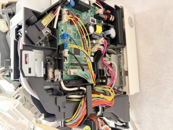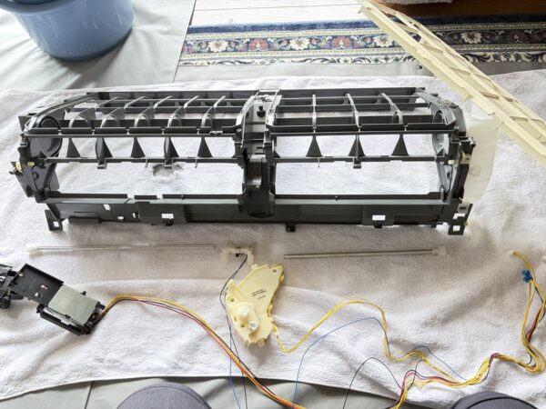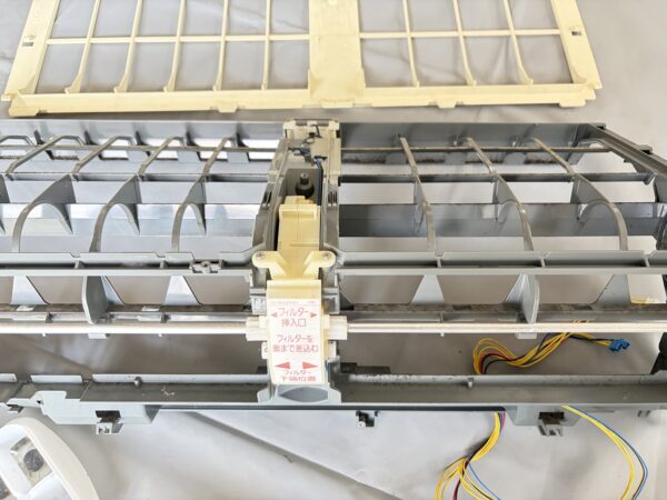 お掃除ユニットが外れました。かなり油分も感じられるので洗いたいです。電装部をすべていったん取り外します。パーツ洗いでは、これが一番手がかかりました。