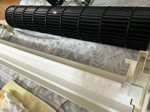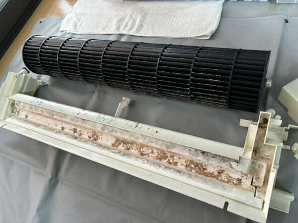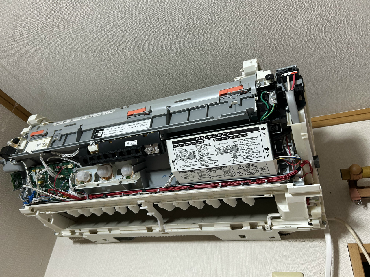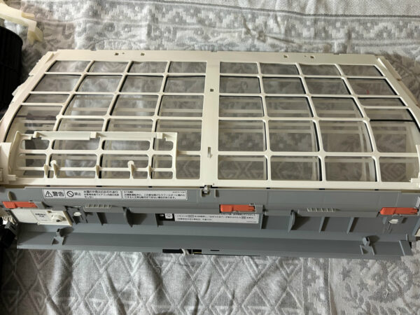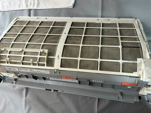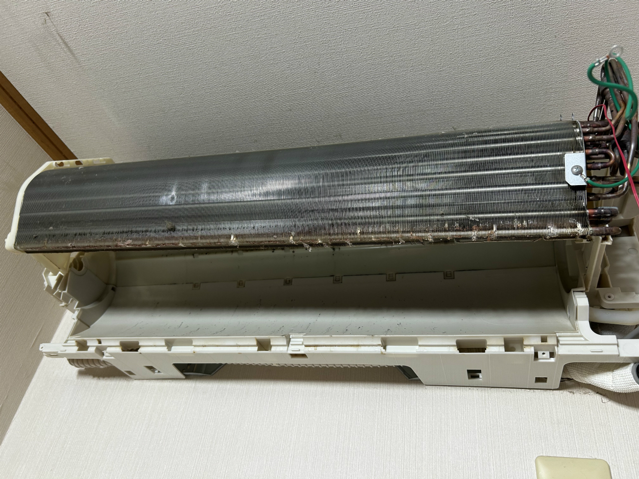 そして中はこんな感じです。エアコンだってわからないくらい何かがかぶさっています。
