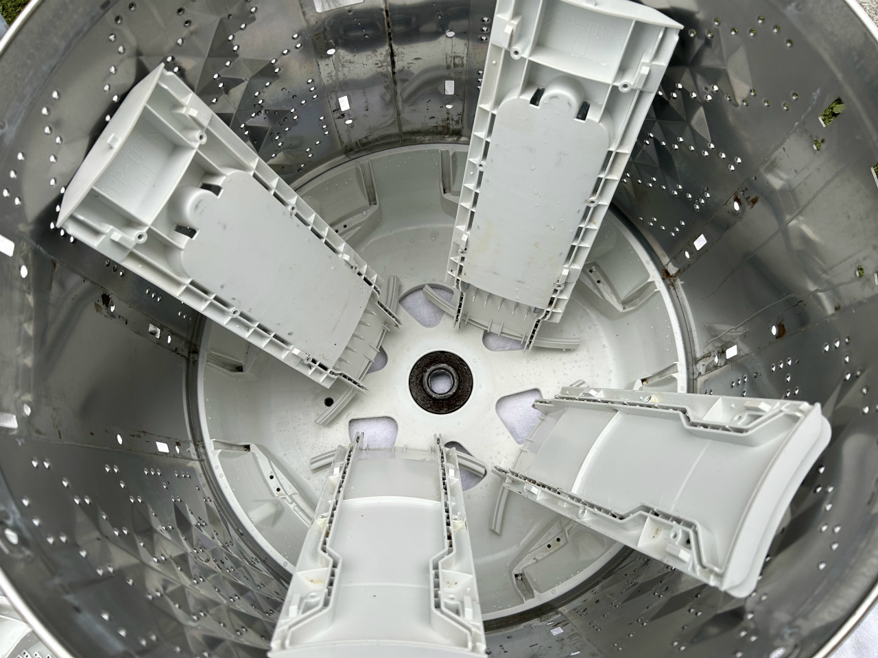 初めての洗濯機クリーニング、脱水槽がなかなか抜けません。先日購入した3爪のギアプーラーを使ってみました。いい感じにセットできるのですが、途中で1つの爪が外れてしまいます。いつもの通り2爪プーラーで抜きました。