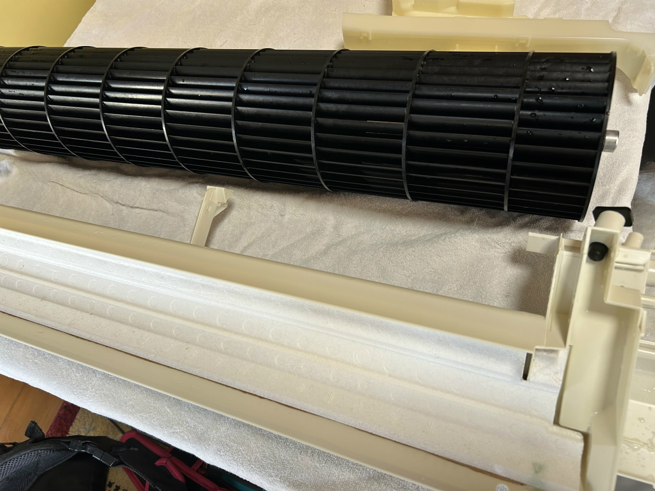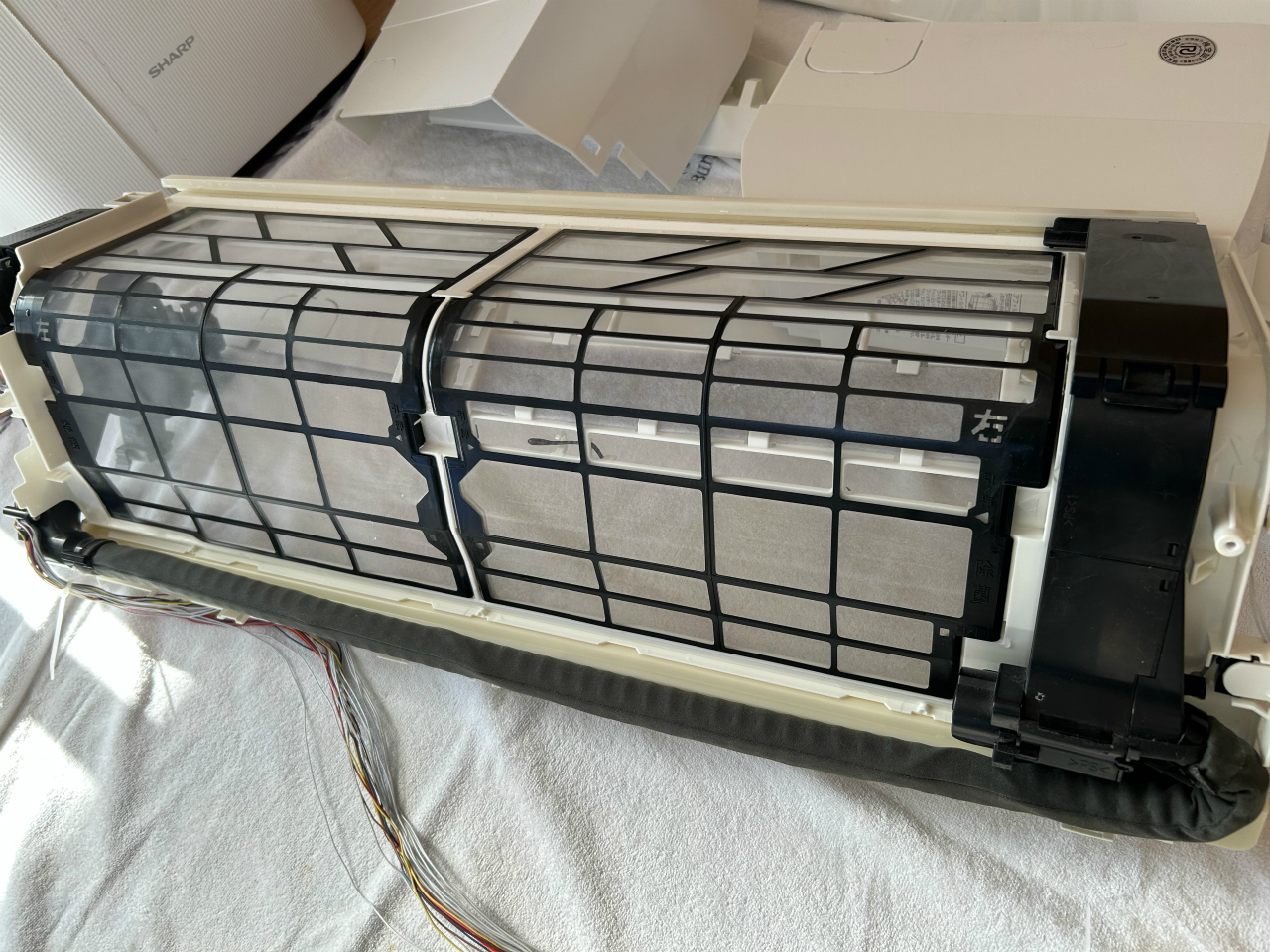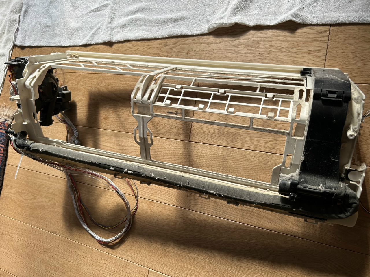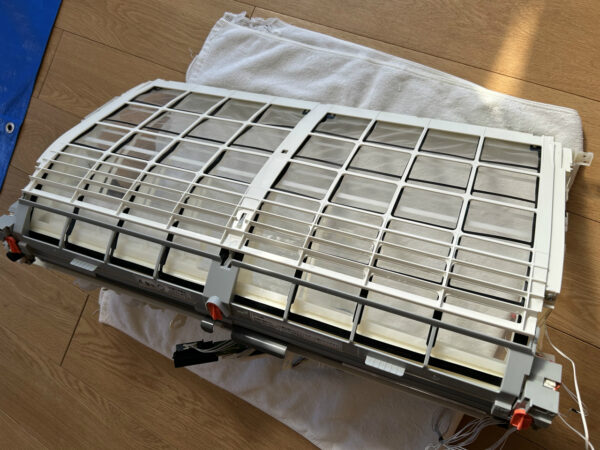 組み立てて、フィルタ―お掃除を試運転。問題なくノズルが往復しています。エラーも出ません。もっともより重要なのは空調するかどうか。室外機が元気に動き、暖かい風が出ます。1台目完了。