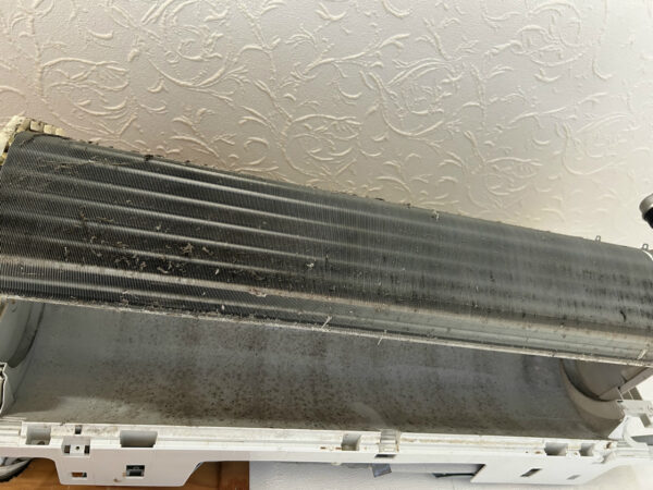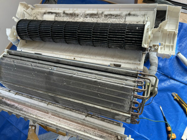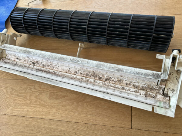 熱交換器の汚れを防ぐためのロボットが付いているのに、熱交換器もかなり汚れています。そして今どきのエアコンはファンから汚染が広がります。