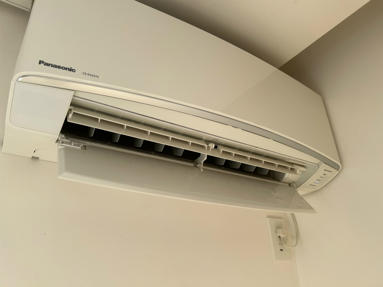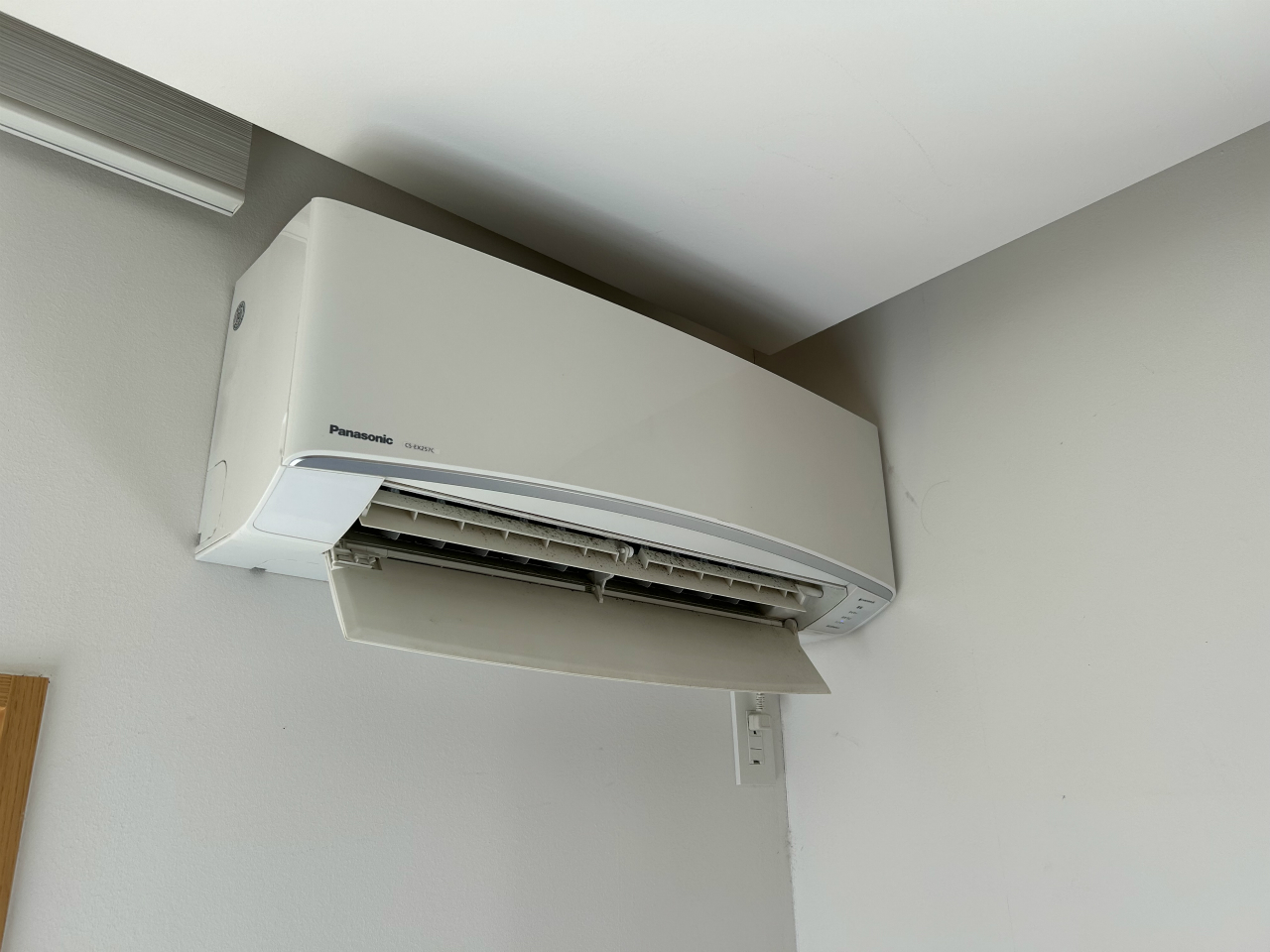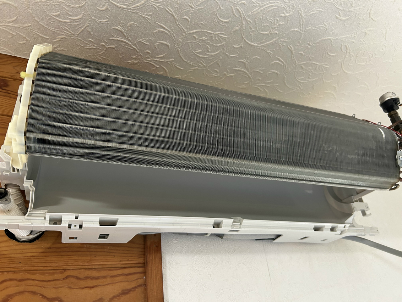 今回CS-EXの右側が壁にピタッとくっついた設置です。この分は右側に基板のある型で、配管は右で壁貫通でした。ですので、室内機を取り外してのクリーニングでお見積りしています。