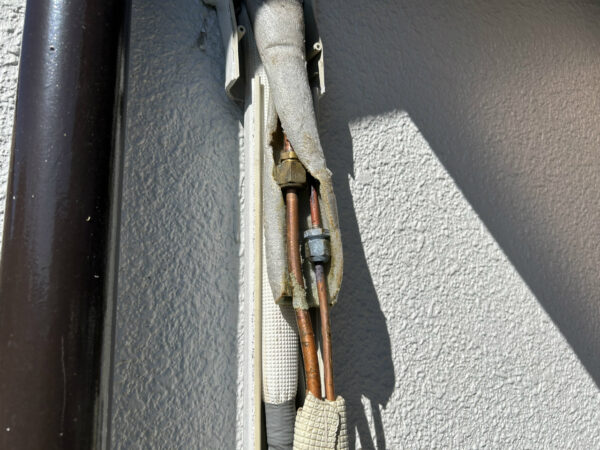 配管テープを剥がしていくと、なんだかべたべたします。室外機にガス圧のメモがあったので、何かしら問題を抱えているのかもしれません。