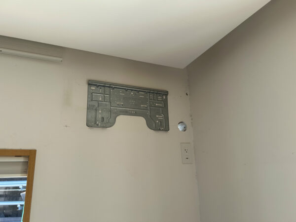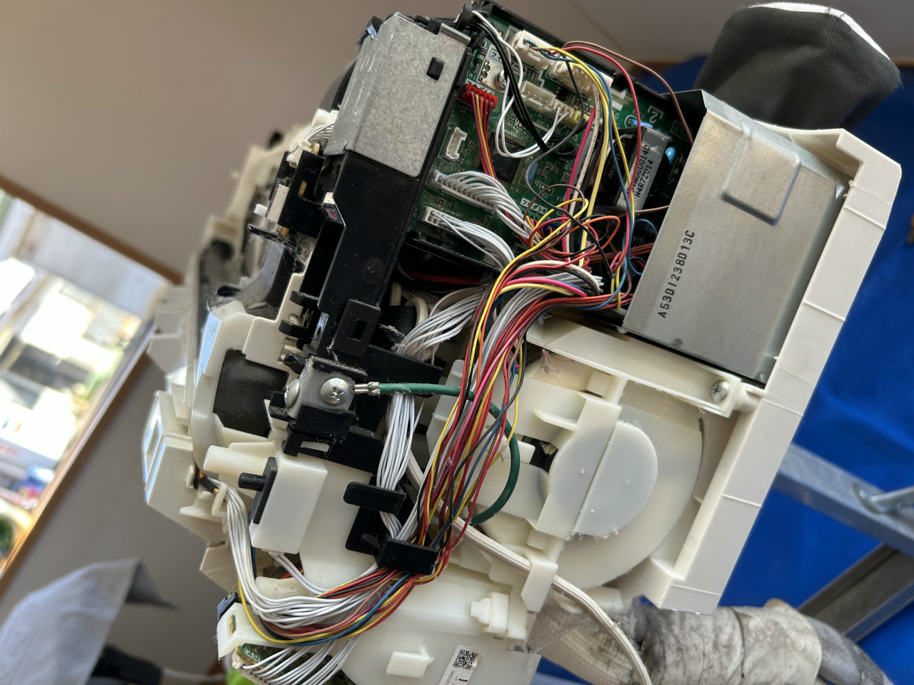 室内機を降ろして、壁面はいったんこんな感じになります。おろした室内機と、基盤内配線取り回し。時間をかければ据え付けのまま基盤を外せるでしょうか?