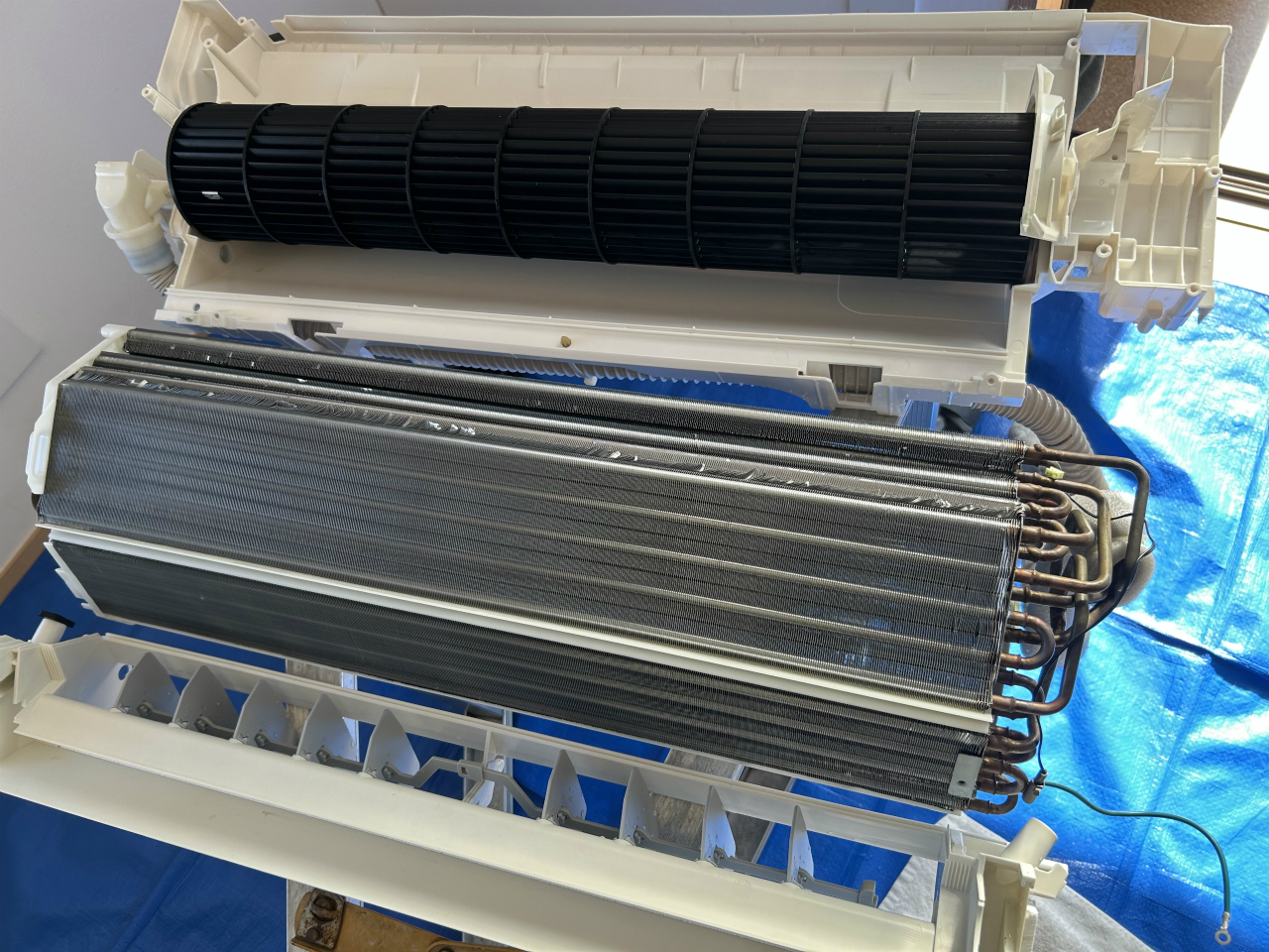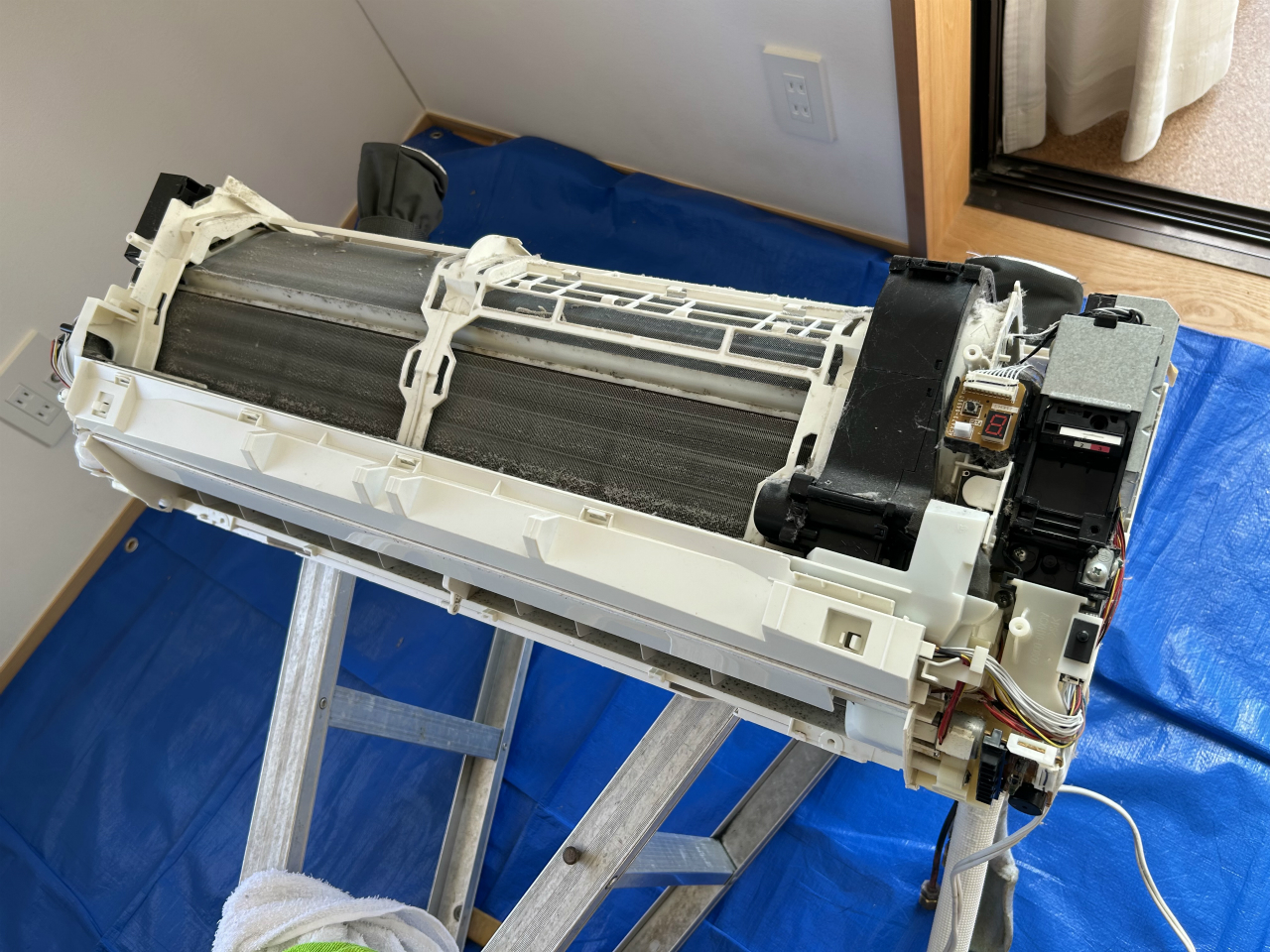 室内機を降ろせば、あらゆる角度から洗浄可能。汚れの取り残しが限りなく少ないです。熱交換器は温水ピアで高圧洗浄。そのほかのパーツは漂白剤を使った除菌洗浄です。