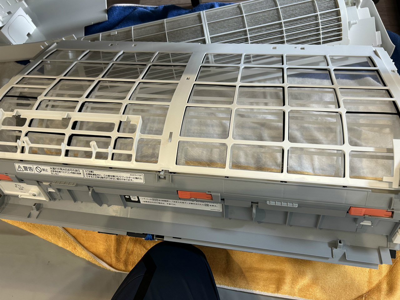 パナソニックの熱交換器左側って、軸受けと左側面が干渉しあう感じで、取り外しと復元に空間の余裕が必要だと感じています。それをこんなに壁面に寄せて付けてあるから大変。何事もちょっと余裕や遊びを持たせることが大事だと思います。ここで15分はロスした気がします。