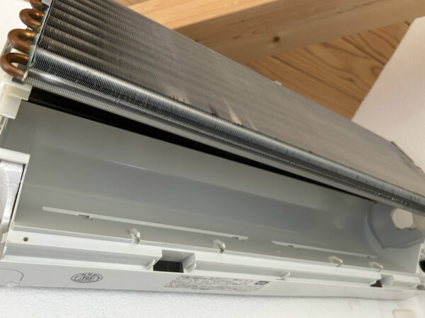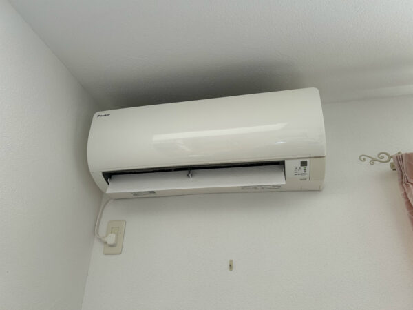 1階リビングのF40UTEP-W、ダイキン2018年製。これは左側で配管が壁を貫通しています。壁掛けオーバーホールしやすいです。