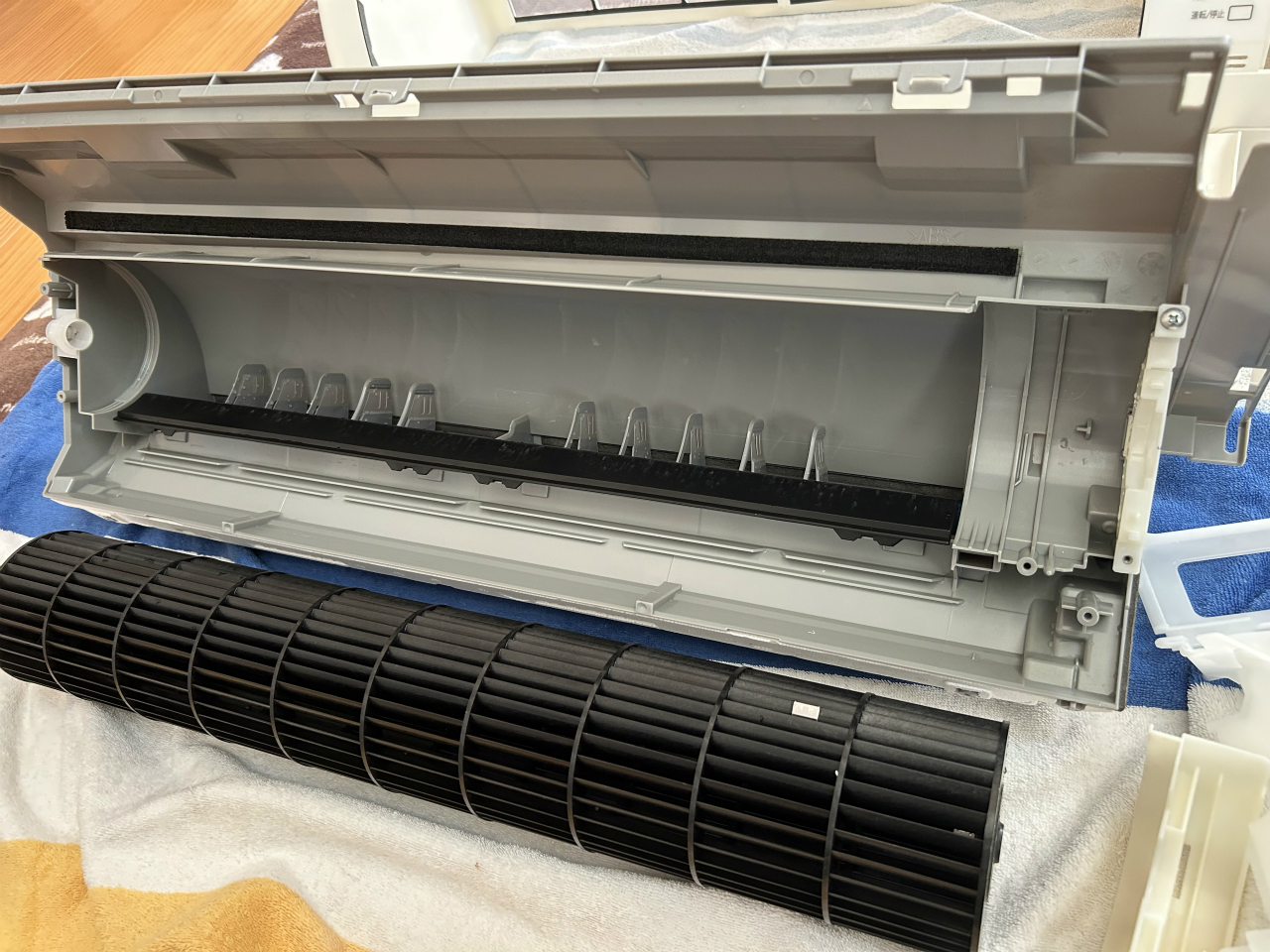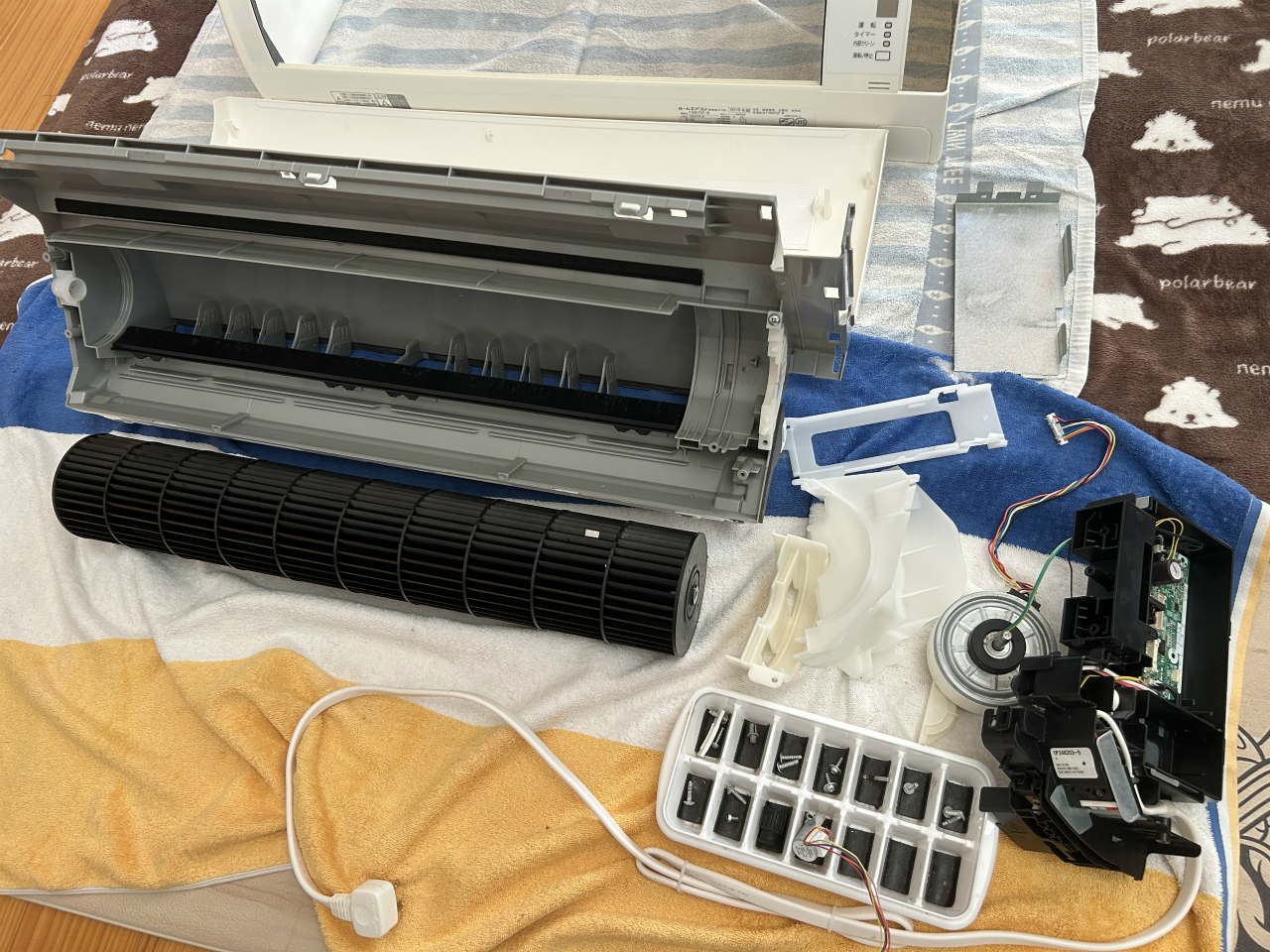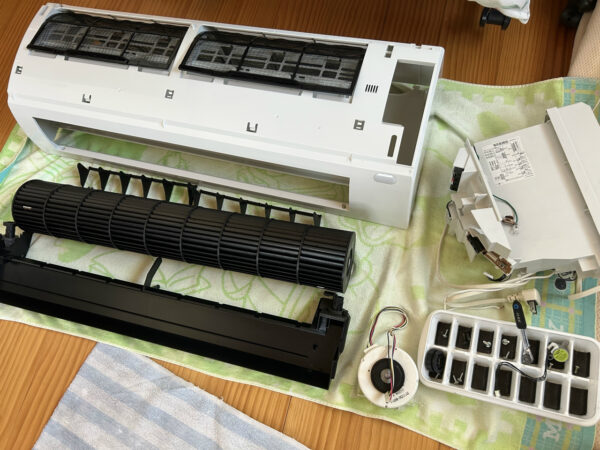 壁掛けオーバーホールでエアコンクリーニング。復元を待つパーツたち。