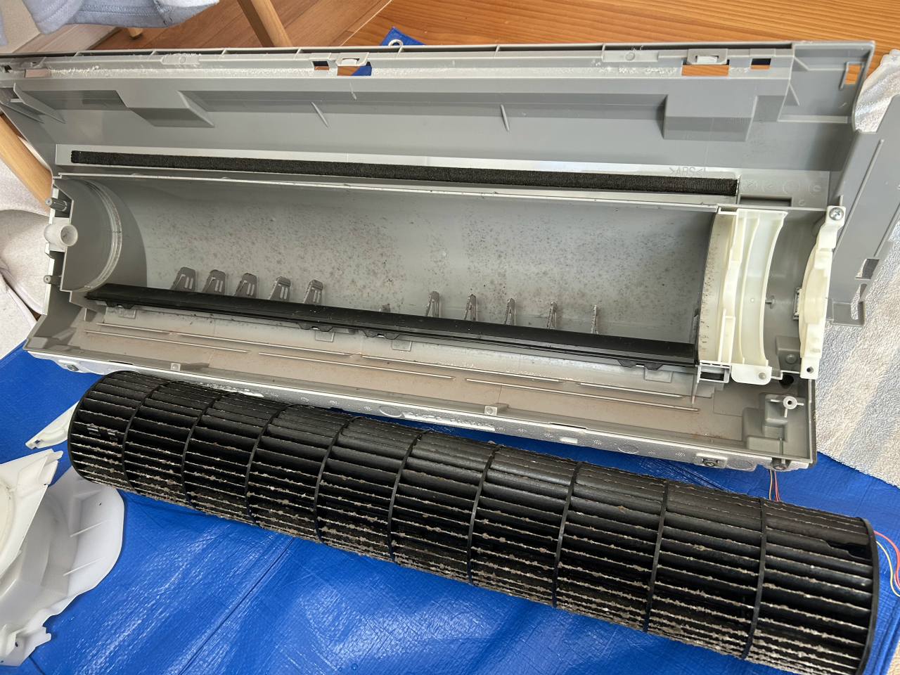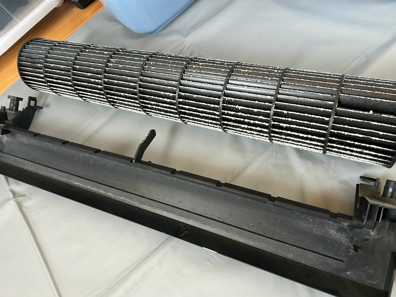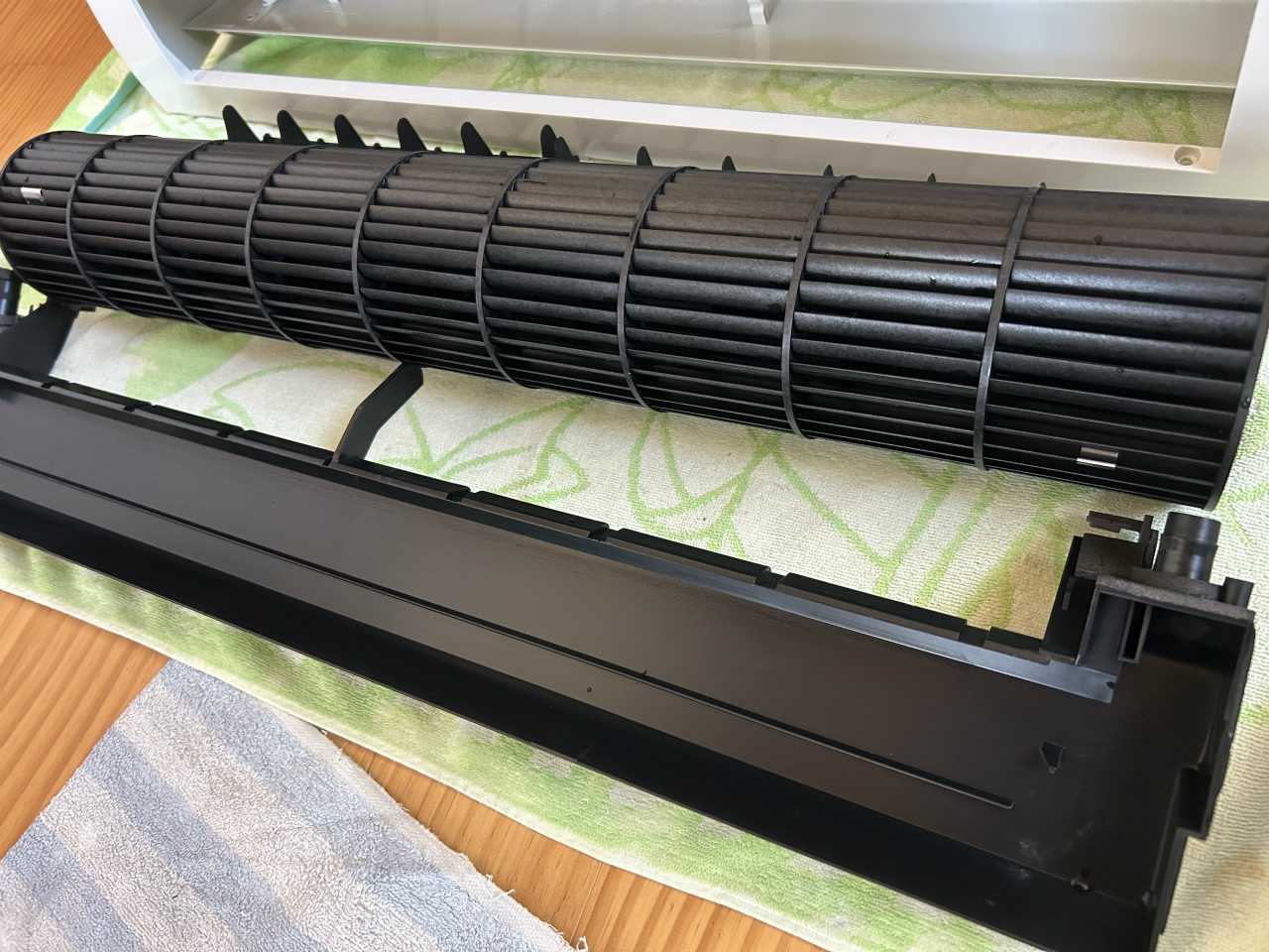 壁掛けオーバーホールでエアコンクリーニング。復元を待つパーツたち。