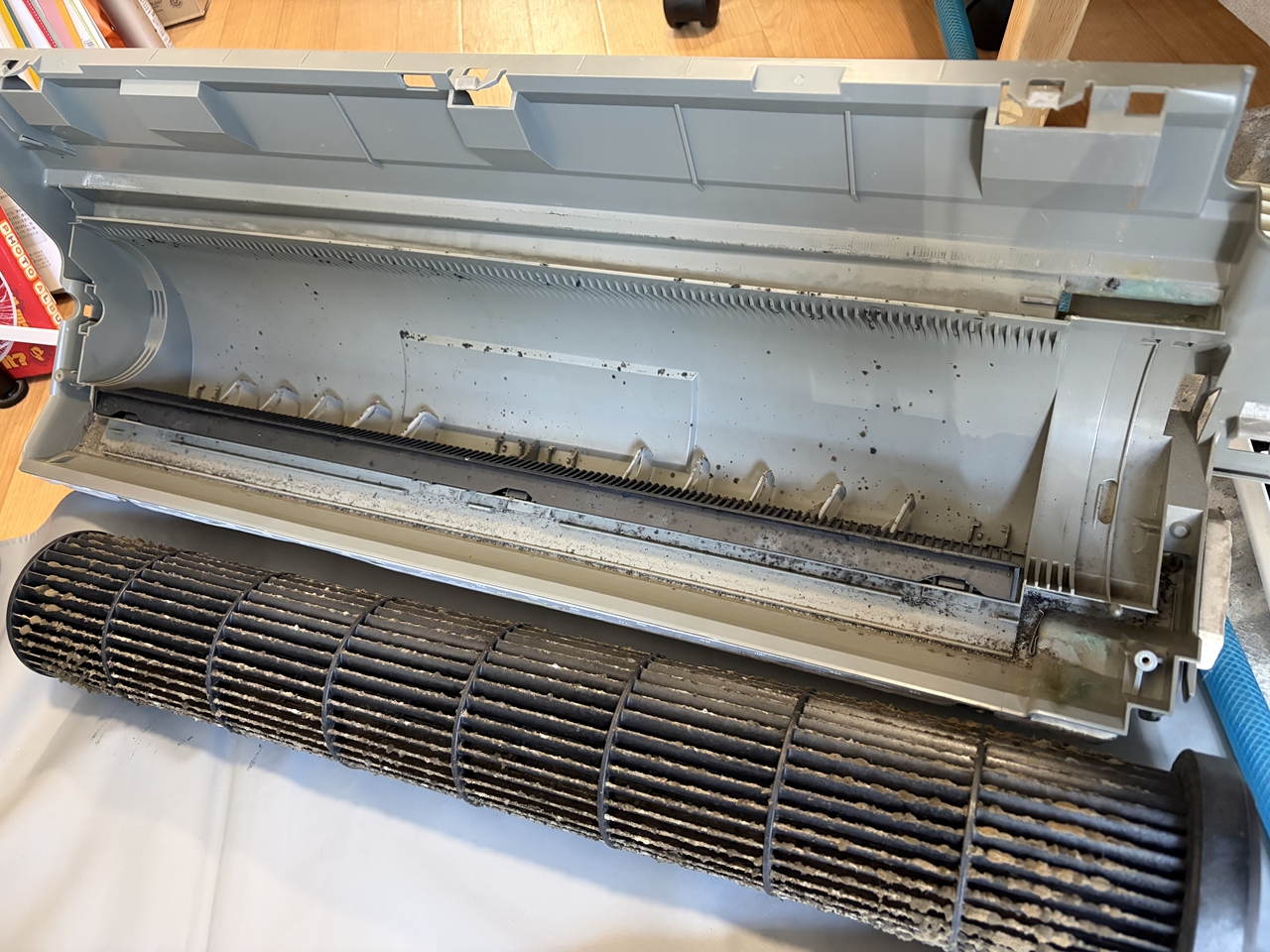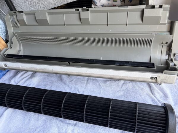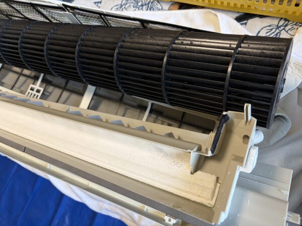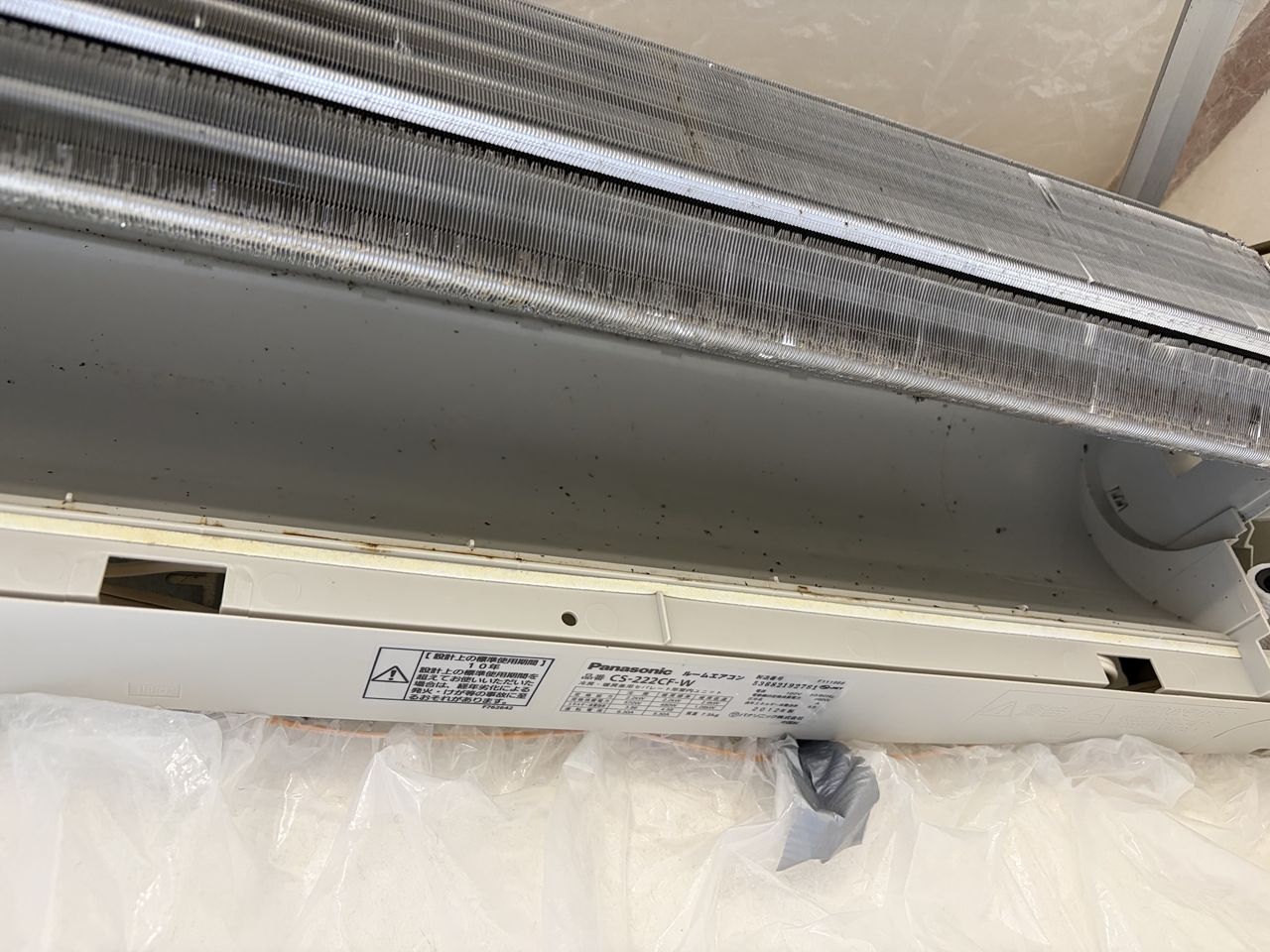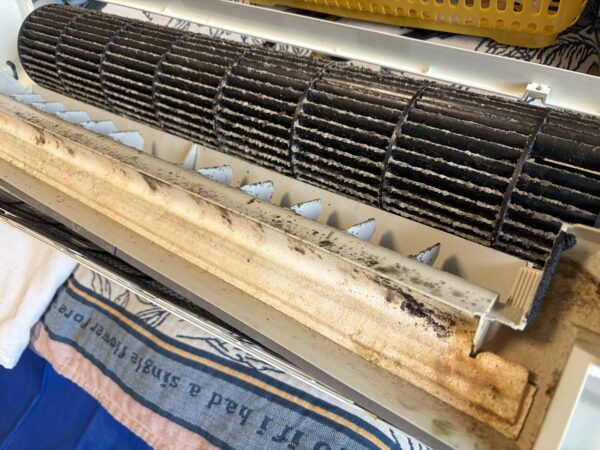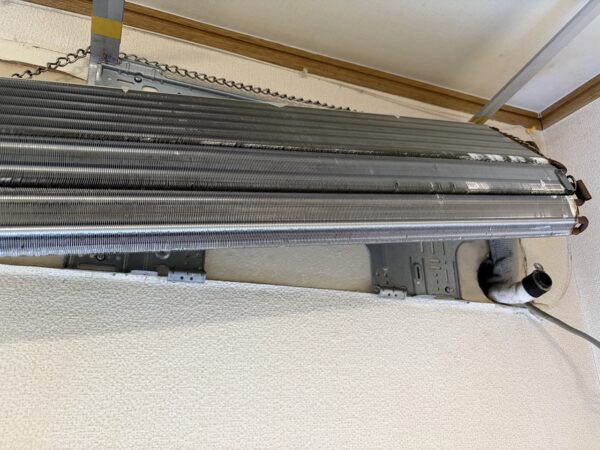 壁掛けオーバーホールにします。そんなに汚れているようには見えなかったのですが、フィンの間に隠れていた黒い粒が流しても流しても出てきます。