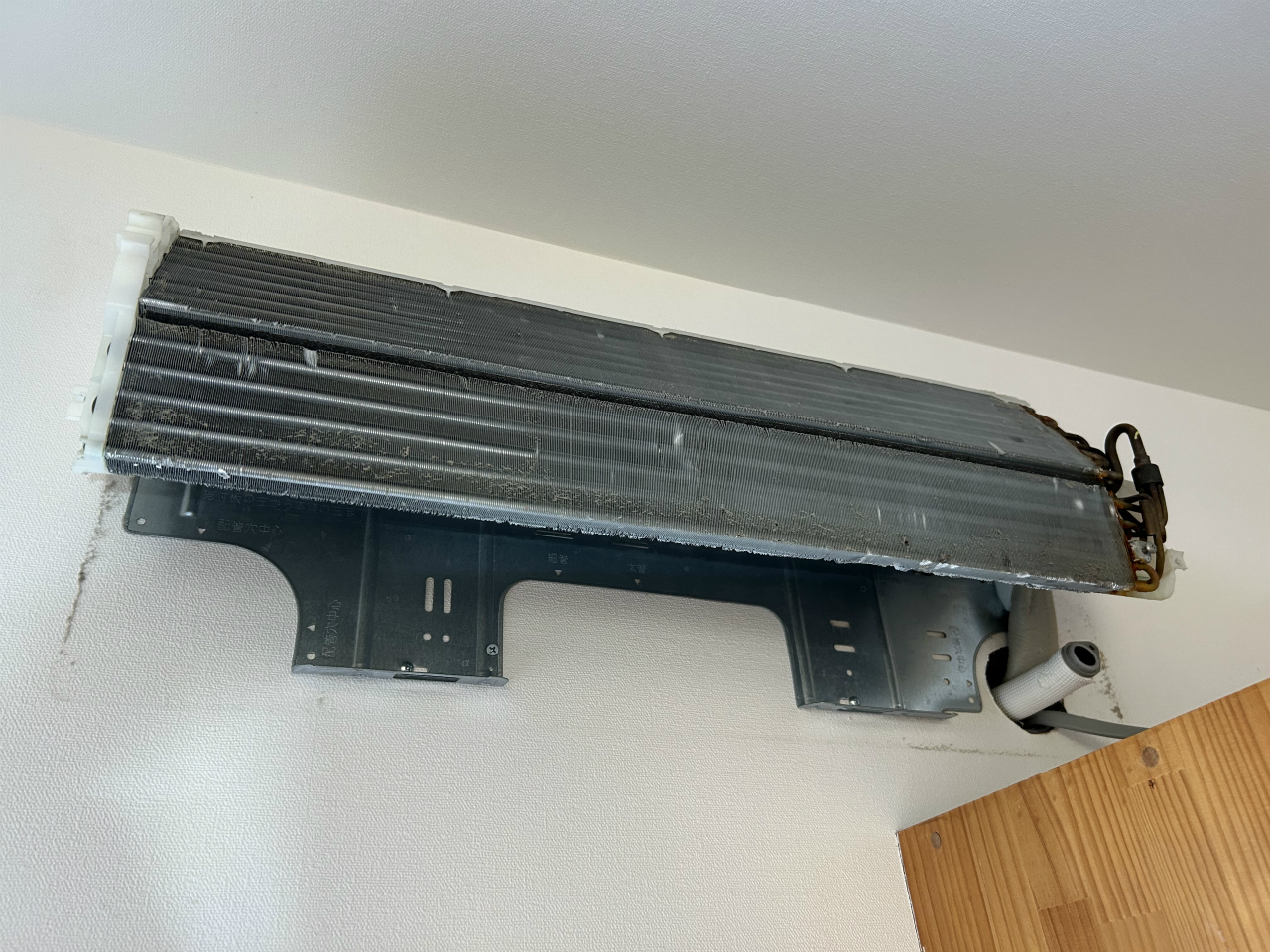 たぶんですけど、エアコンが先についていて、あとから棚を作り付けたのではないでしょうか。右下壁貫通で、その下に棚があるので、下部ボディーを降ろすスペースが足りません。