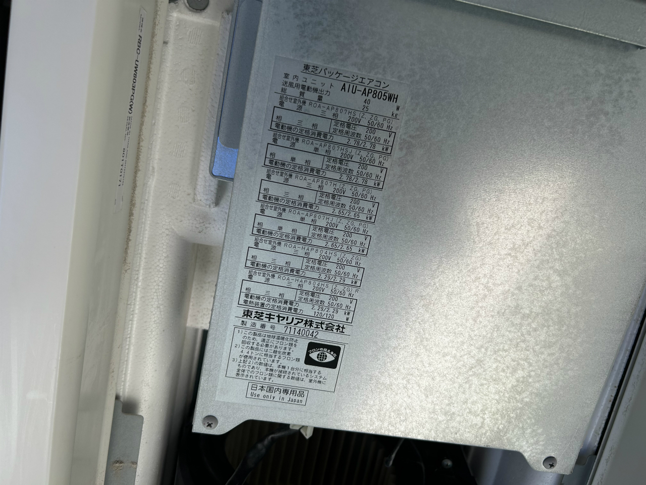 早速リビングに案内してもらいます。AIU-AP805WH、天井埋め2方向、東芝製、リモコンは無線タイプ。Nさんから伺っていた型式はRBC-UW803PG(W)でした。偶然写っていますが、天井化粧板の型式だったんですね。