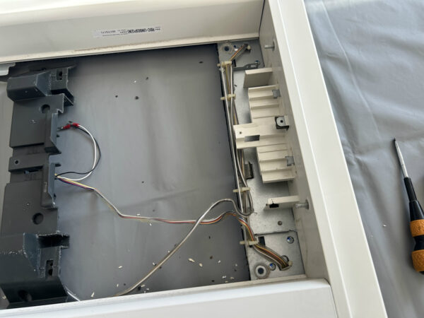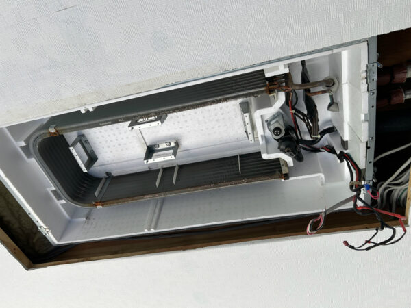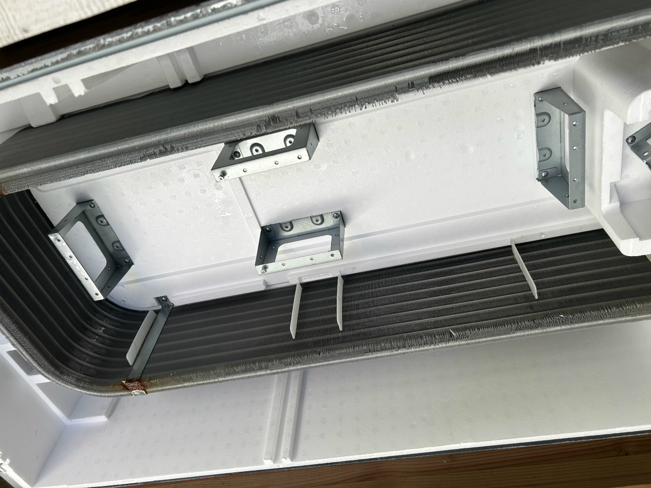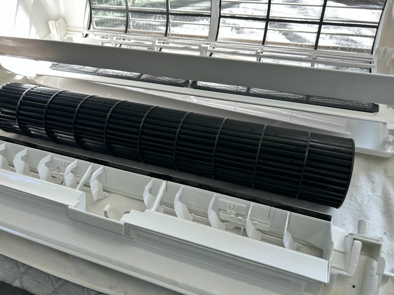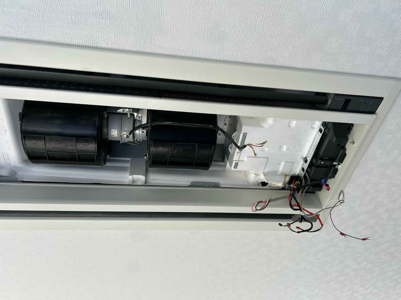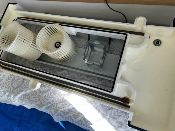 グリルと大きな2枚のフィルターを外すと、構造が見えてきます。本体ケースが大きめに作ってあり、内部部品が余裕を持って配置されています。作業中、化粧板は大きくて重かったですが、ファンモーターは軽く、両側2つのシロッコファンなので脱着が楽でした。