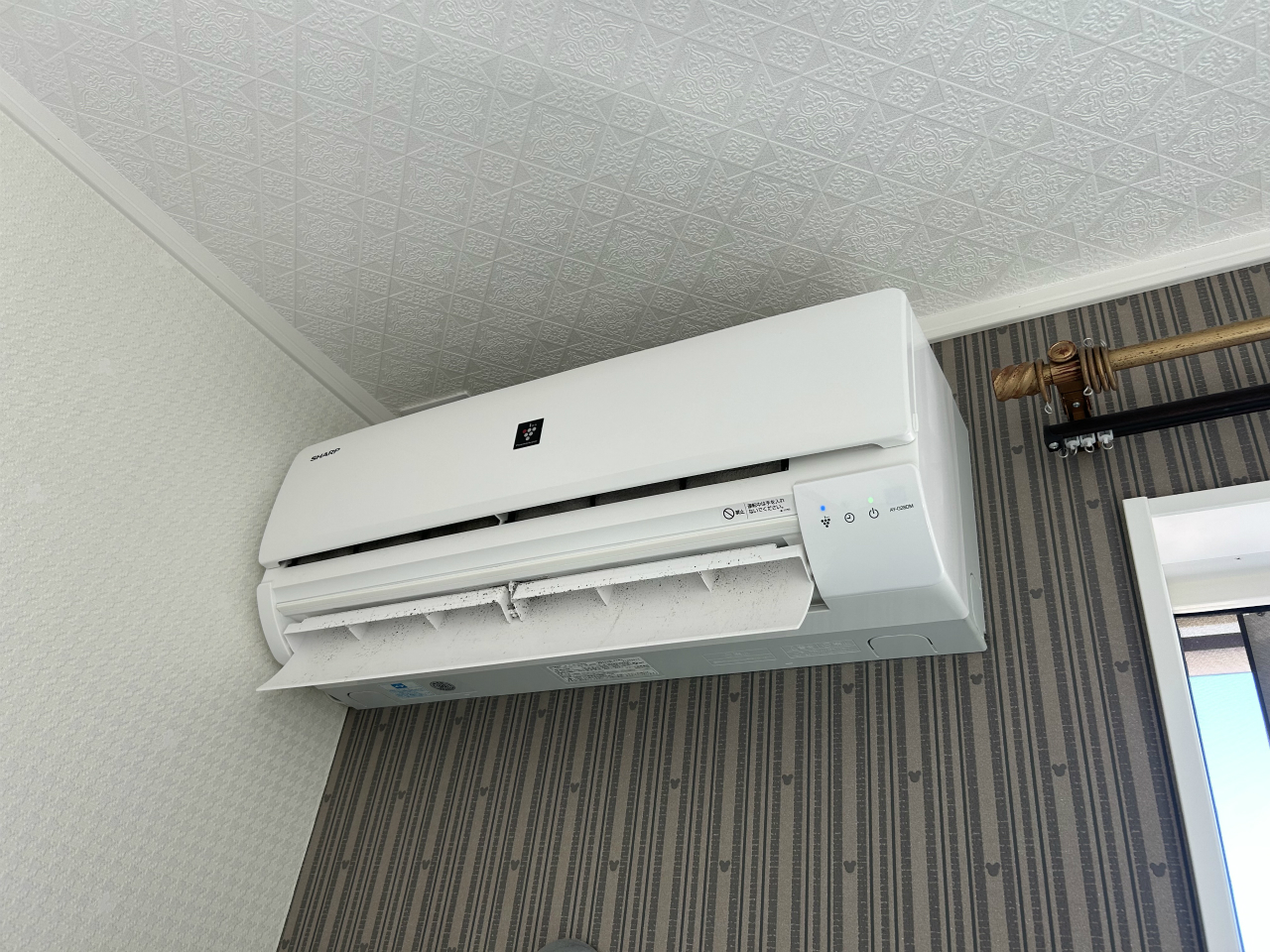 だいたい2時間半で天井埋めを洗い終わり試運転。2階寝室の壁掛けに移動します。AY-G28DM、シャープ2017年製。上下風向き板は動作不良になっています。シャープの風向き板、モーターに対して羽が重いのか、壊れているのをよく見かける気がします。
