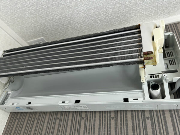 熱交換器は周りに余裕があるので洗いやすかったです。熱交換器の支持金具は鉄製、かなり錆びていて、ドレンパンにももらい錆があります。ちょっと気になりますが、たいていこうなっているので、何か意味があってメーカーはこの材料を使っているのだろうと思います。汚れではないので、お許し下さい。