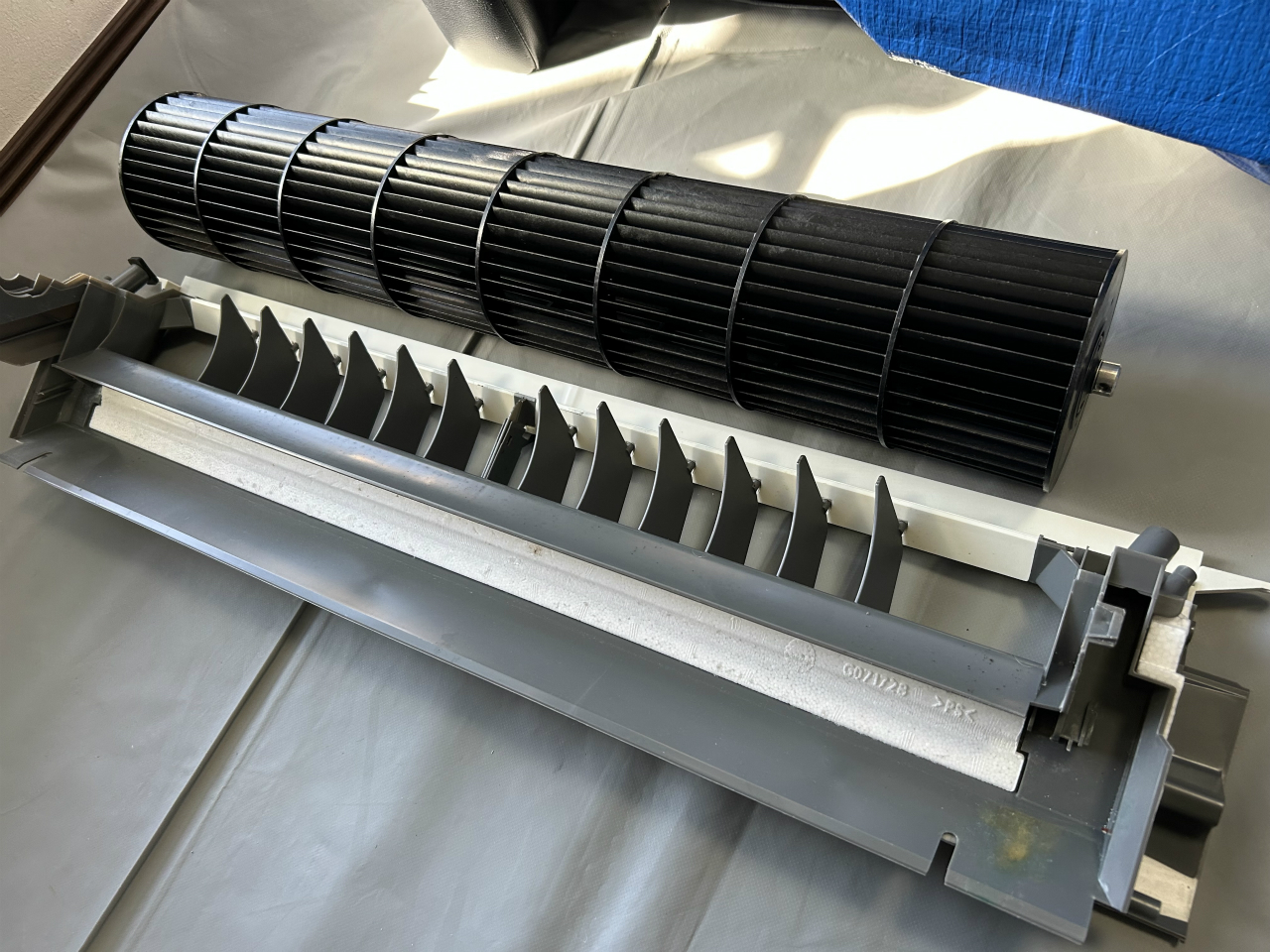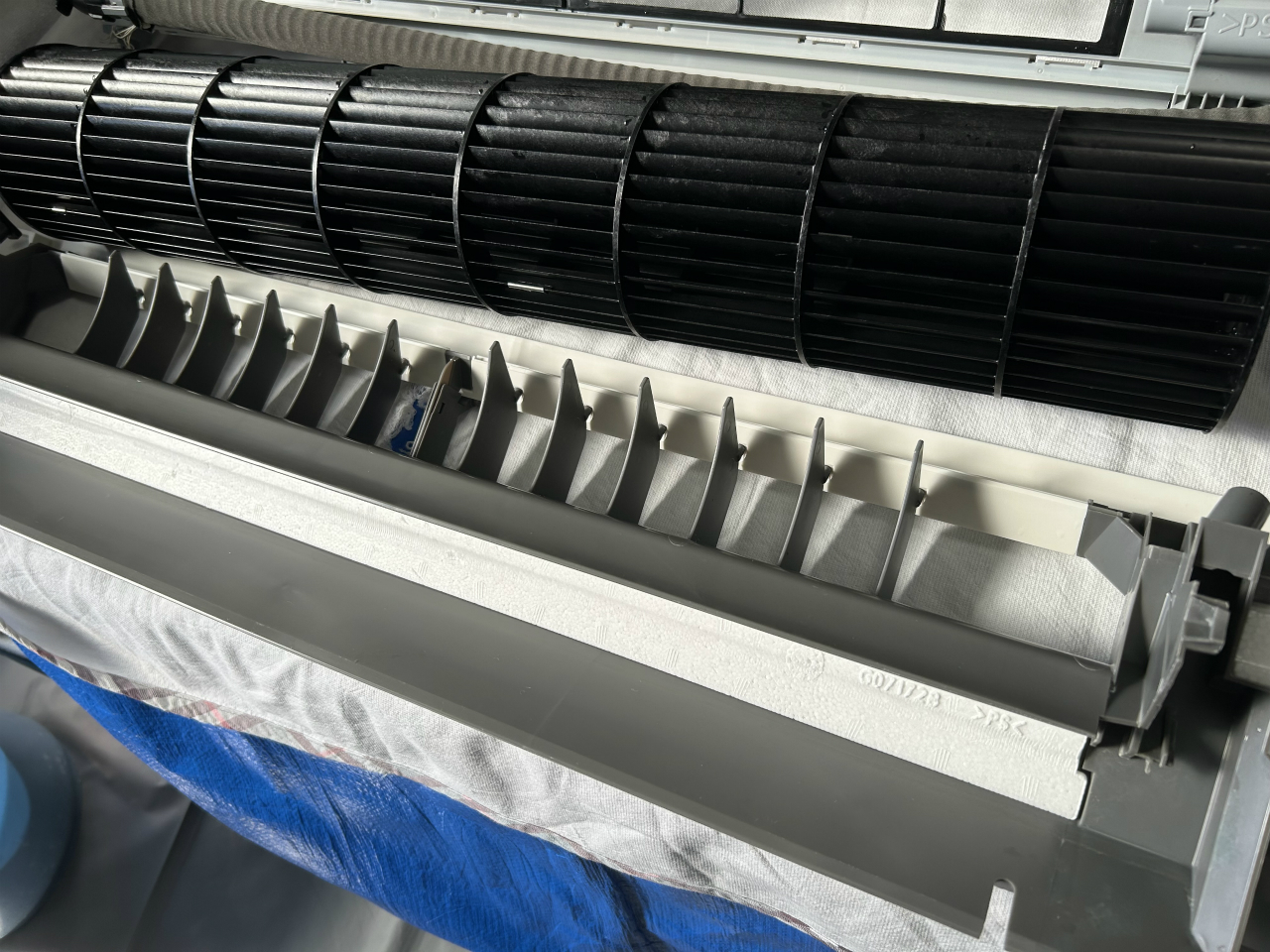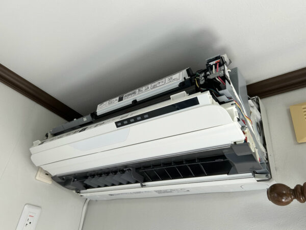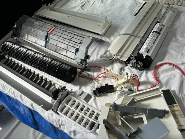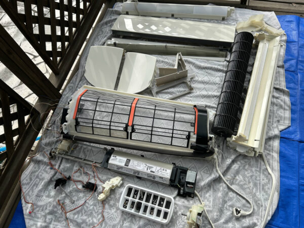 ということで、11月11-13日の3日で早めの大掃除ということになりました。1日目、まずはエアコンから取り掛かります。1台目がCS-712CX2-W、パナソニック2011年製から取り掛かります。すぐ下にはかなり込み入った配線のパソコンがあるのですが、すべて移動済みで、作業スペースが確保されています。復元もWさんが全部やって下さいます。いつもありがとうございます。