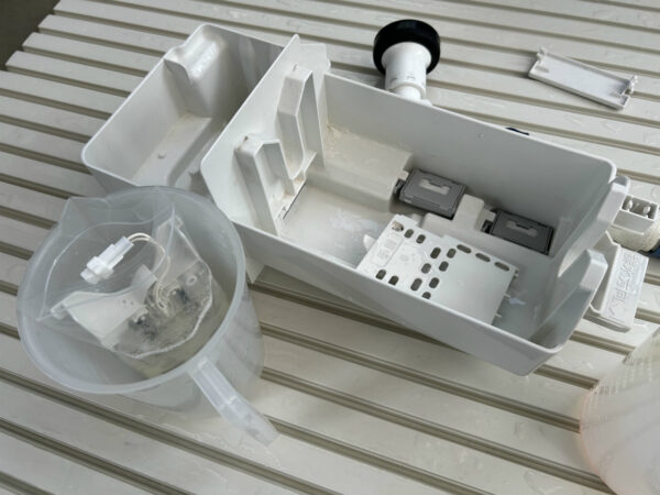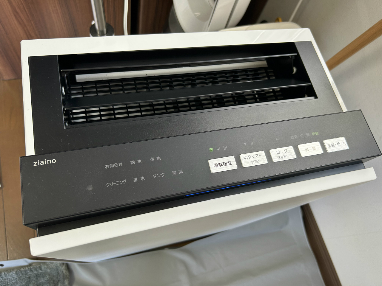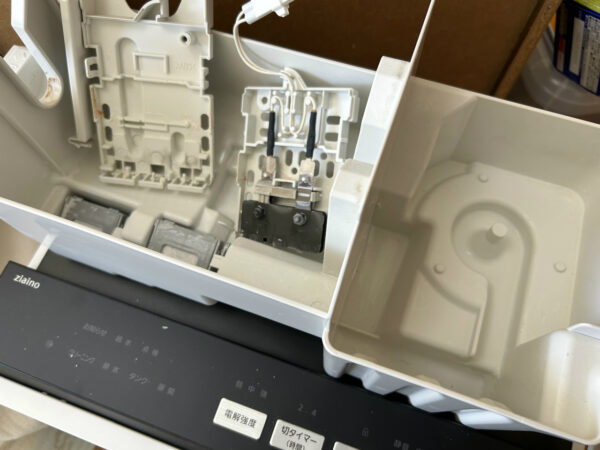 ジアイーノは、加湿器の働きをします。仕掛けがあって、トレイにたまった水に塩タブレットが投入され、その塩水を電気分解して次亜塩素酸水を生成し、それが室内空中にミストとして放出されます。加湿器あるあるですが、水道水のミネラルがかなり蓄積します。「カルキ」と呼ばれる白い堆積物です。