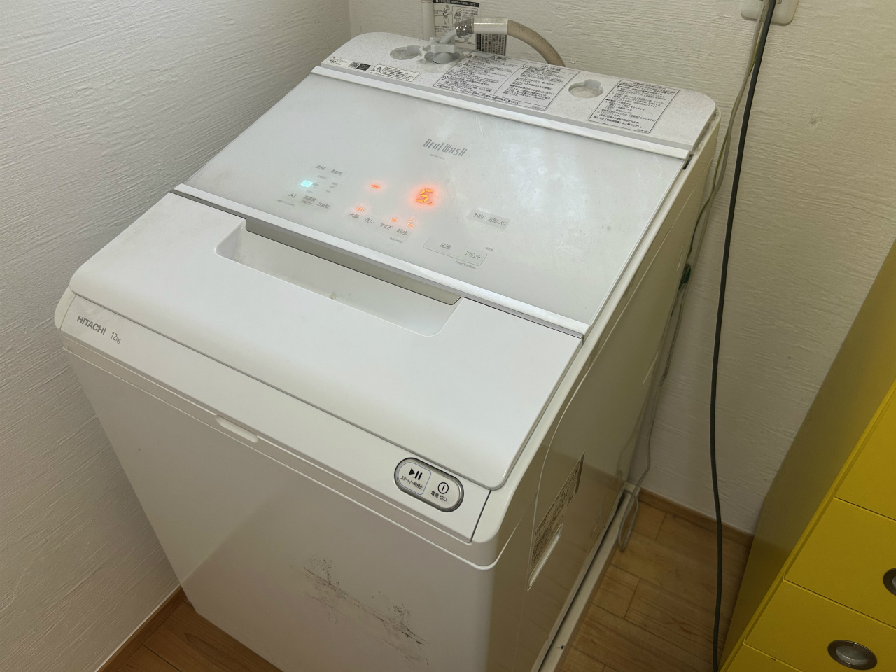 見せていただいた洗濯機は、「大きい!」と感じるサイズ。BW-X120G、日立2021年製。(日立のエアコンもRAS-Xとかつくと身構えてしまいます)。