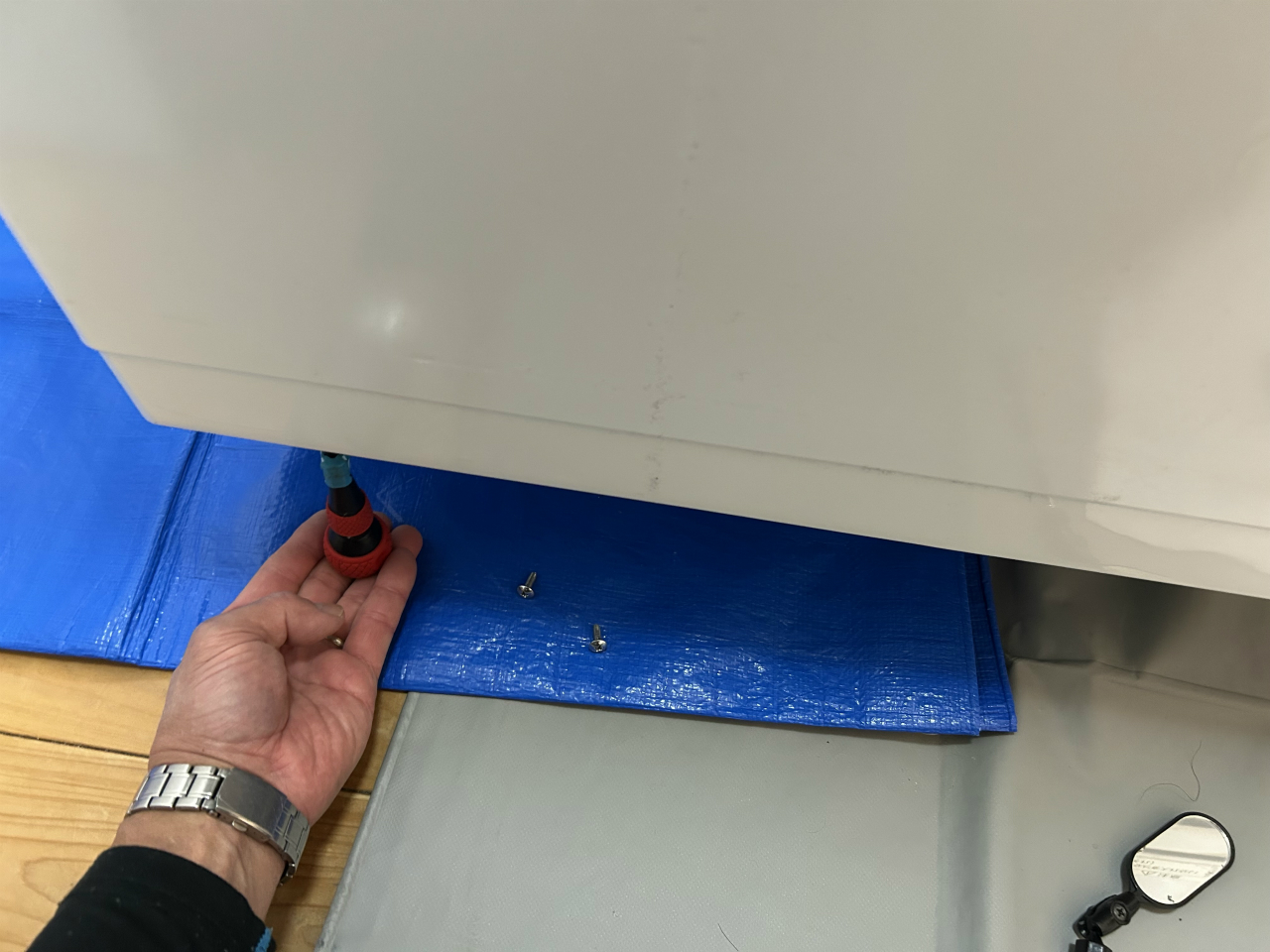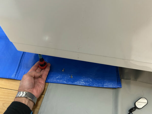 上面化粧板の固定ビスは蓋を開けて、蓋を取って。奥は7ミリ六角で露出しているのですぐわかります。