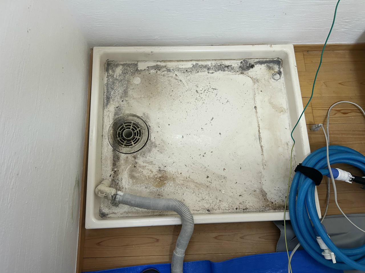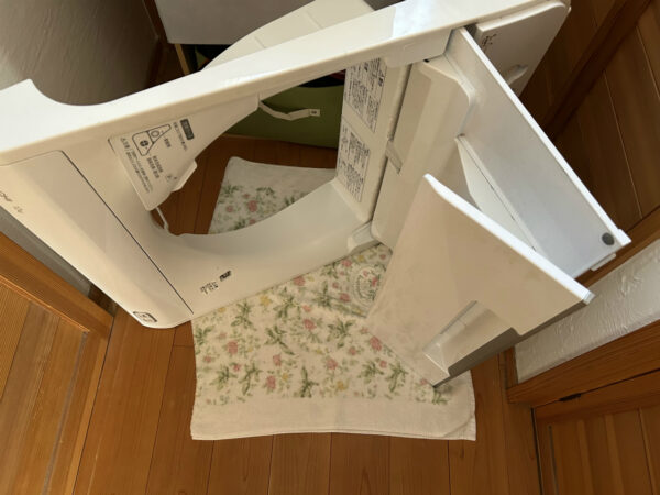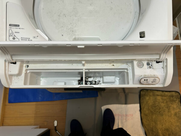 洗濯槽と、洗剤・柔軟剤自動投入ケースの漂白除菌洗浄。自動投入ケースの底に黒カビがあり、洗って水を吸い取る必要から吸水バキュームを使いました。