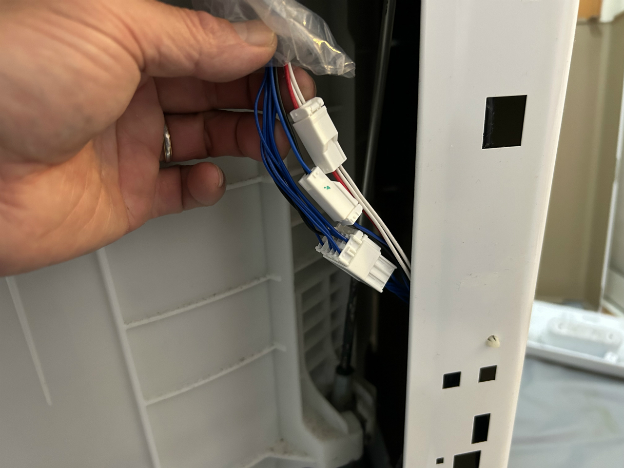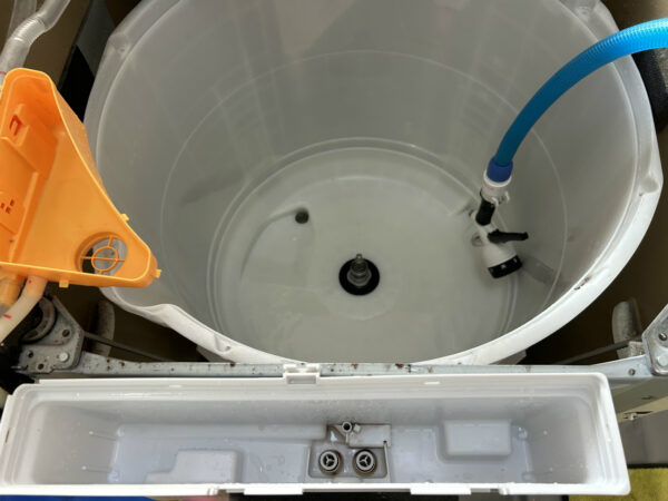 脱水槽内部部品の位置確認。流水経路の前には穴があるとわかります。