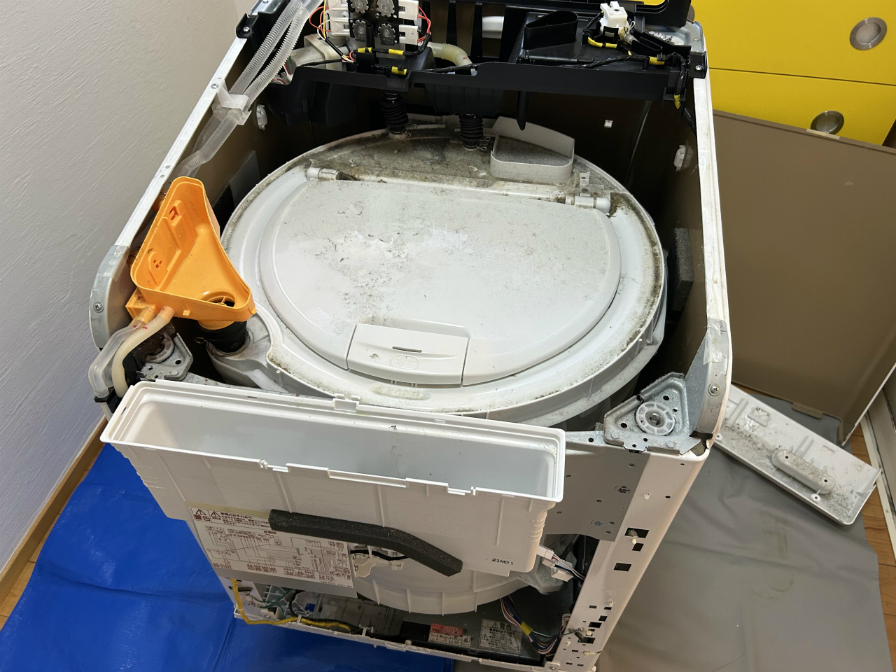 上面化粧板の手前側は、ビスの他に何か所か爪がかかっているらしく、外すのに力が要ります。その後、左側の洗剤・柔軟剤投入口の漏斗(オレンジ色)をくわえている4箇所の爪を外すと、上全体が外れます。ここまでくると、脱水槽が外せそうだな~と思えます。