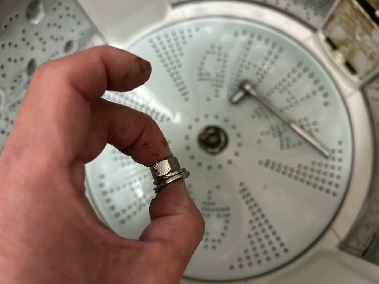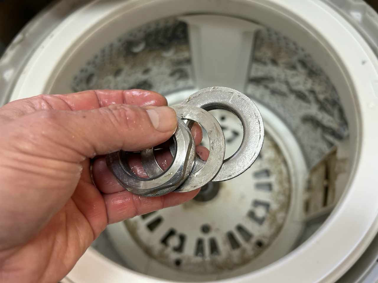 脱水槽の固定はやっぱり大型のもの。普段は38mmフランジナットですが、これは一回り大きい44mm。普段のナット外し工具にアダプターを装着して外します。意外に軽いトルクで外れました。