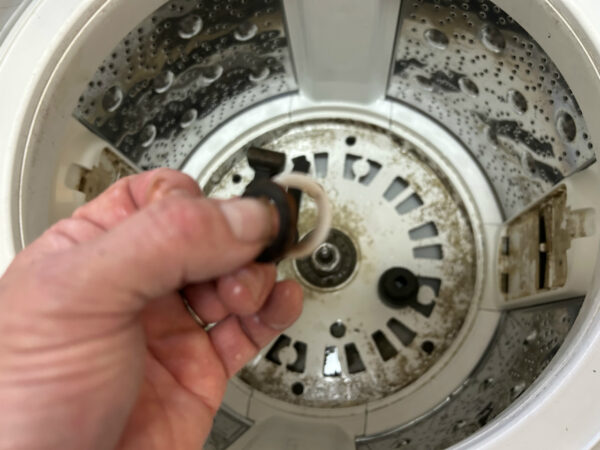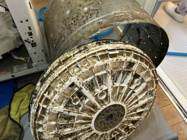 脱水槽も固着がなく、あっさり抜けました。後ろの黒いユニットが邪魔するので、当店のように2人がかりでないと抜けません。一人の場合は、黒ユニットを外す必要があるでしょう。