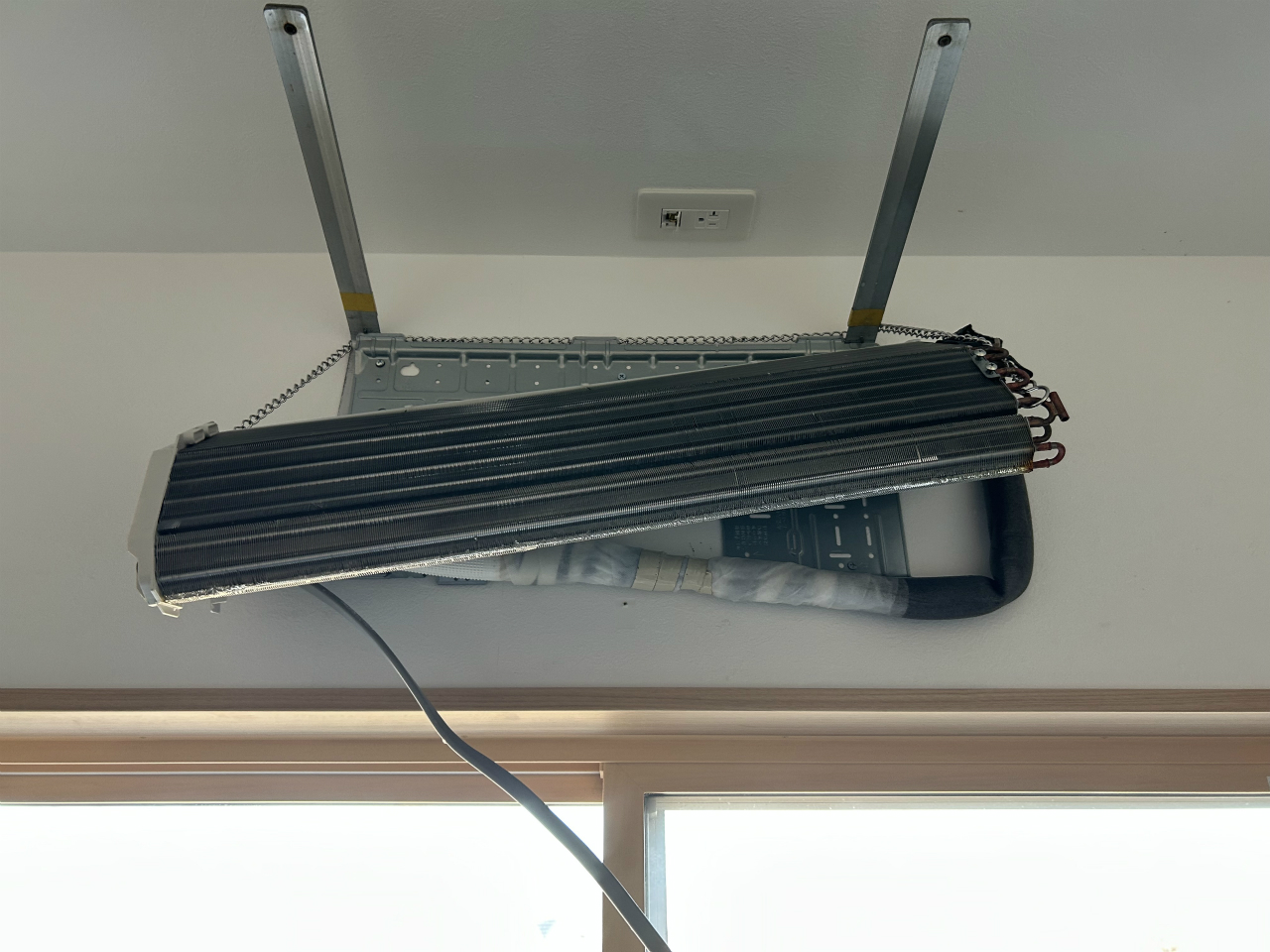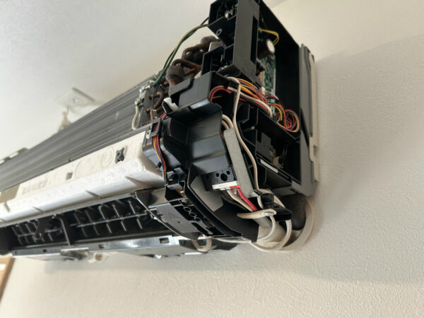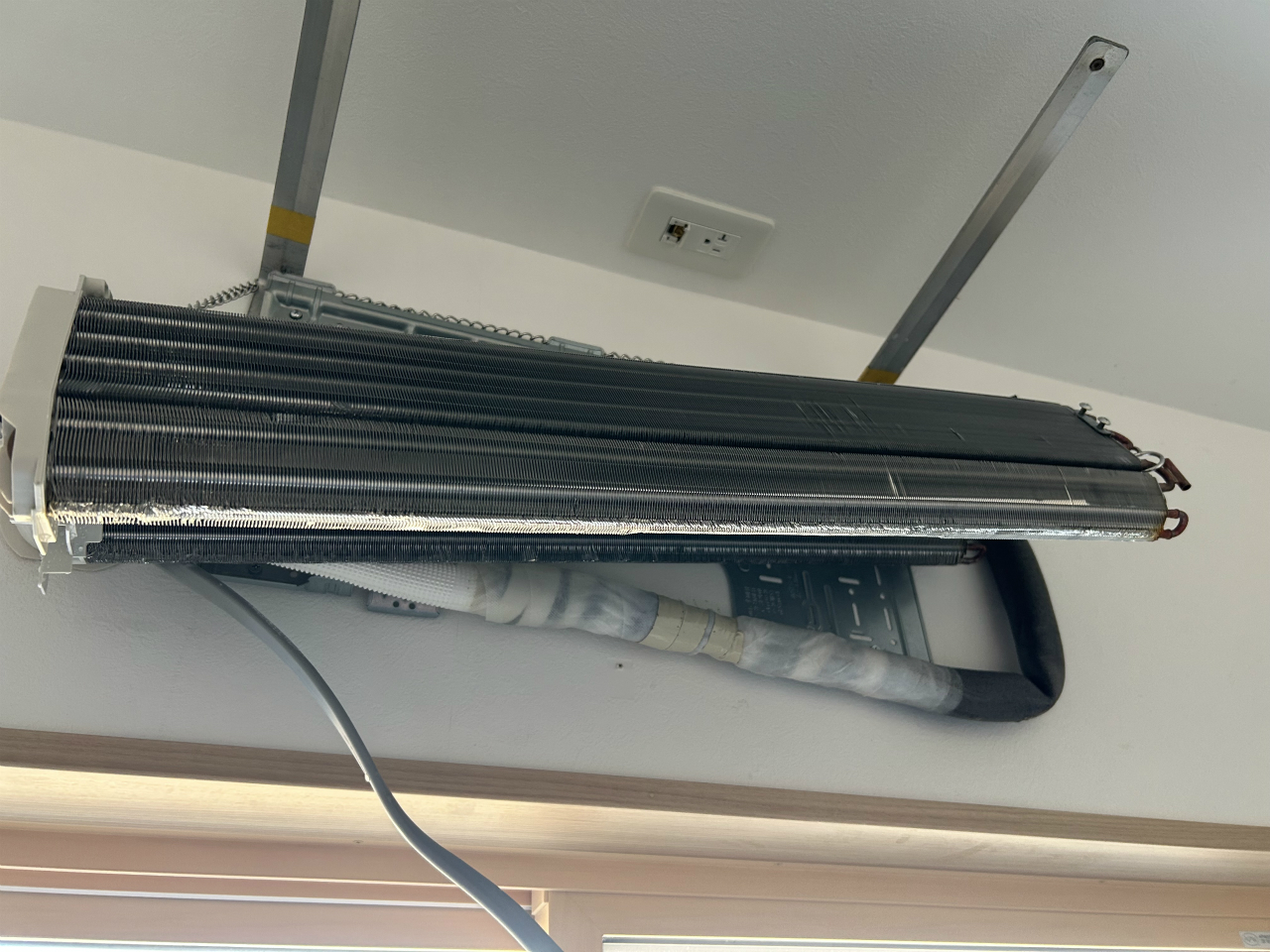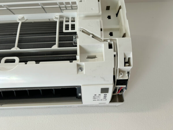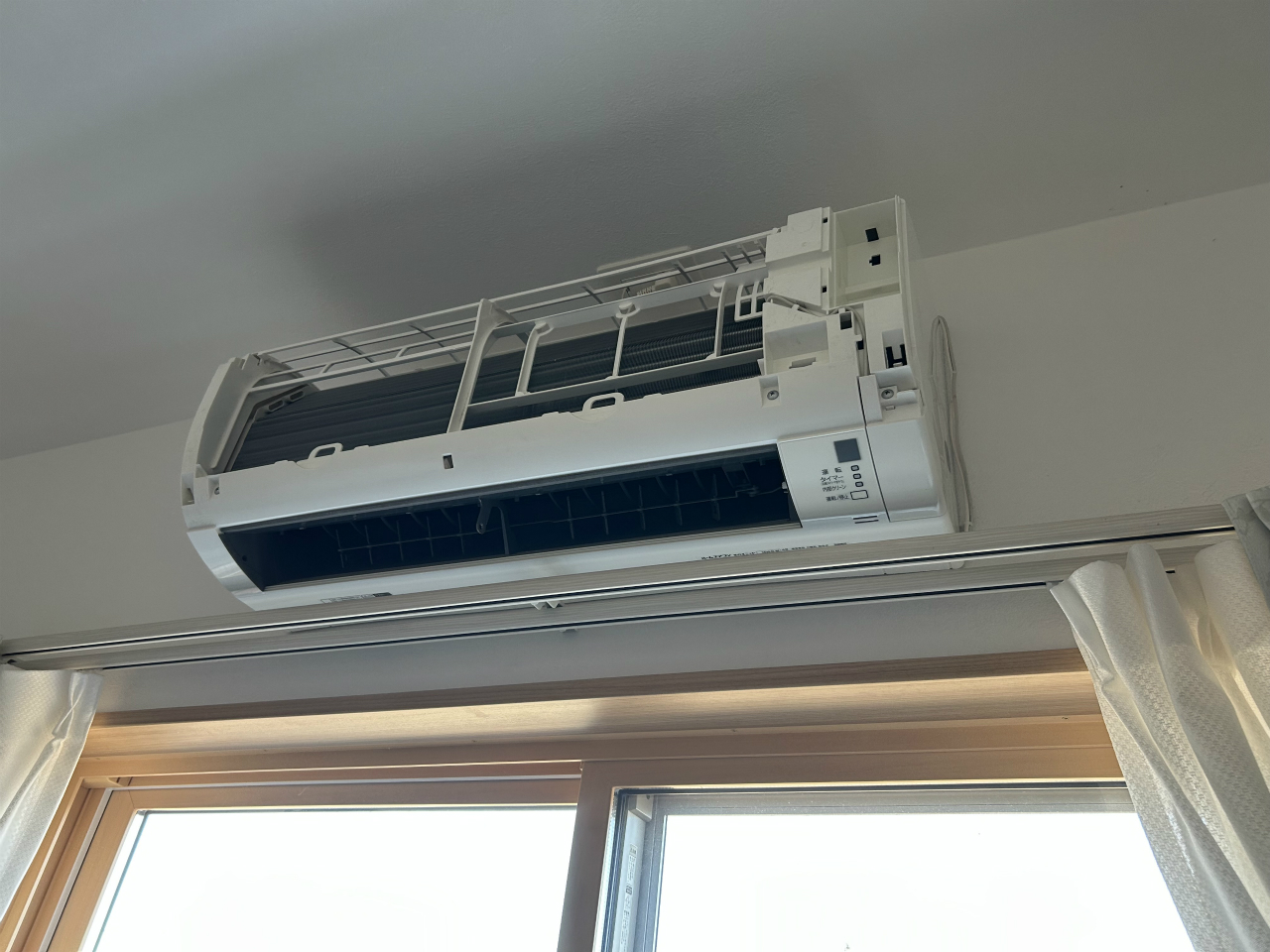 2台目は息子さんの部屋の分で、エアコンをつけると咳が出るということですから、クリーニングが必要な状態ですね。弟がすでに外せるものを持ち出した状態です。なぜこれを撮ったかというと、カーテンレールが近いなと思ったからです。
