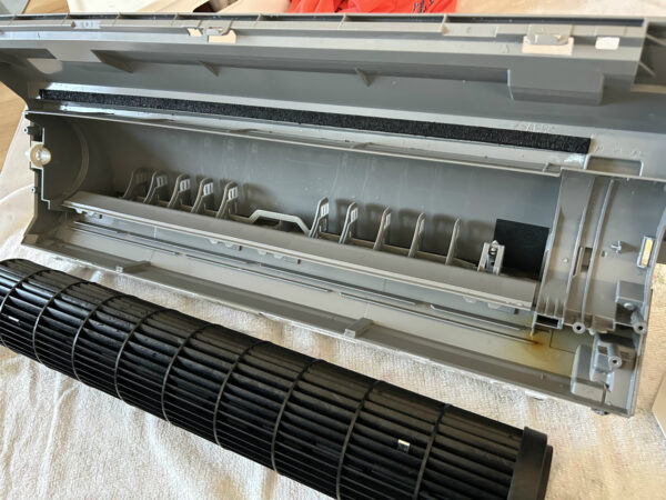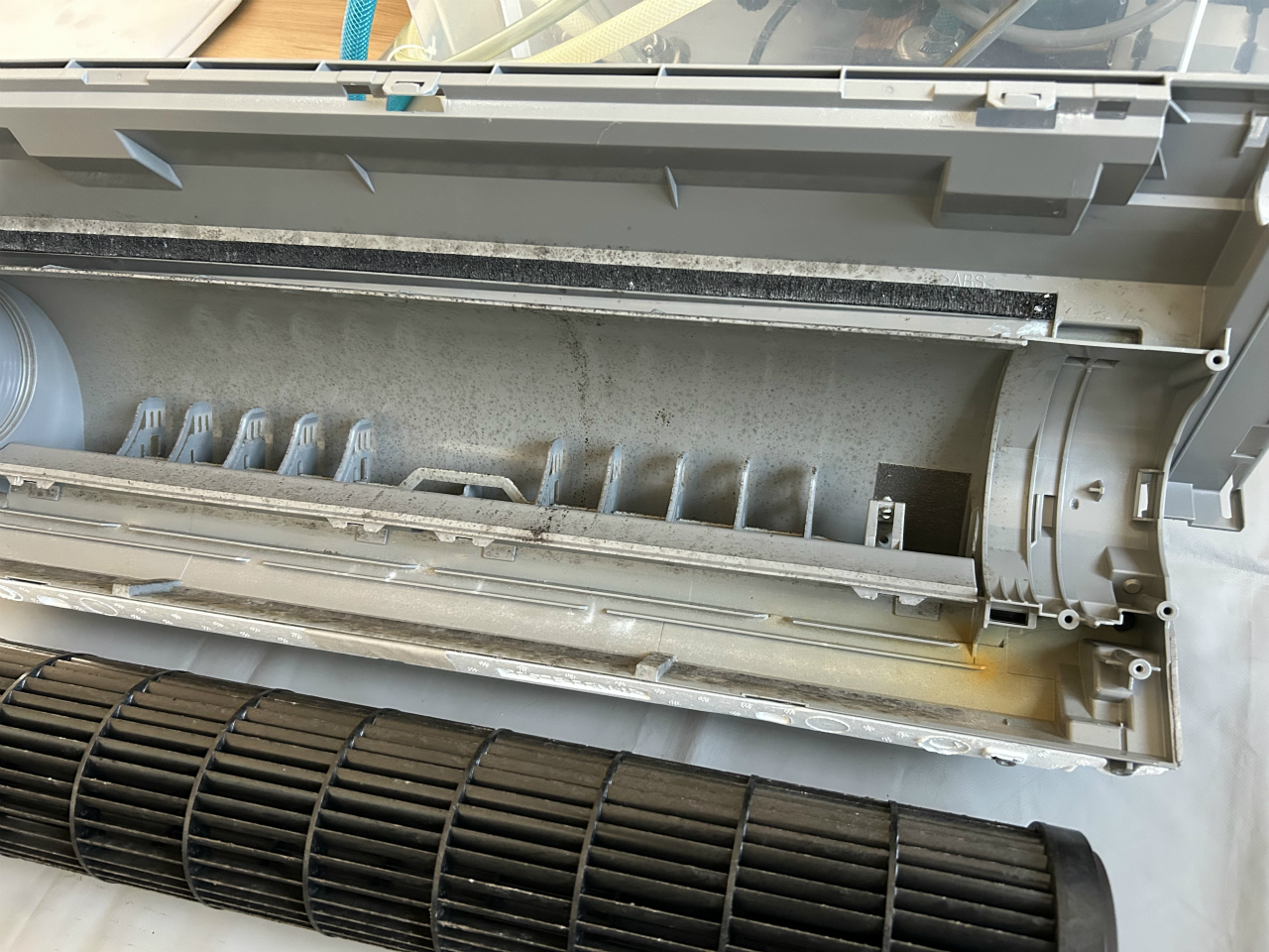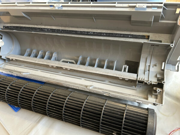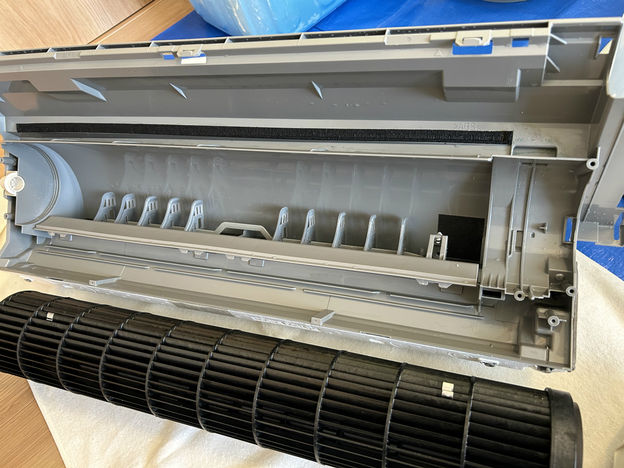 ドレンパン一体型の下部ボディとファンは、外に持ち出して漂白剤で除菌洗浄。