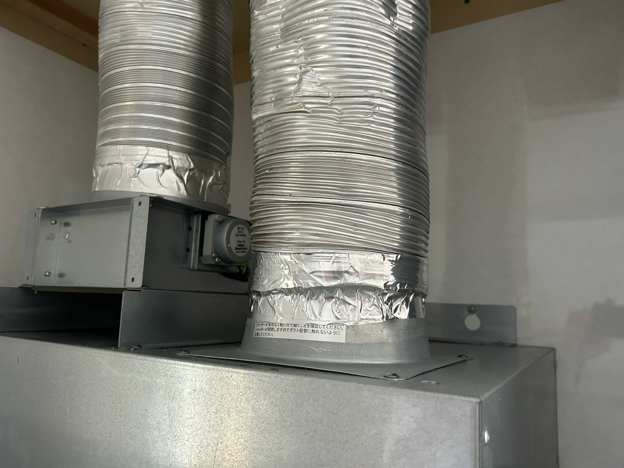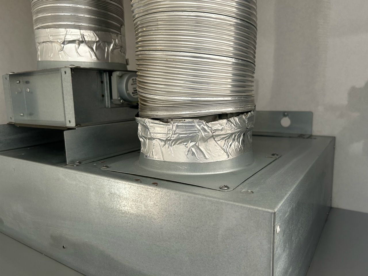 フード上の幕板を外してみました。なんと排気だけでなく、吸気ダクトもつながっています。吸気ダクトの弁は電動です。よく見ると排気ダクトは外れている気がします。まだ延ばせる余地があるのでダクトを伸ばし、新しくテーピングしました。