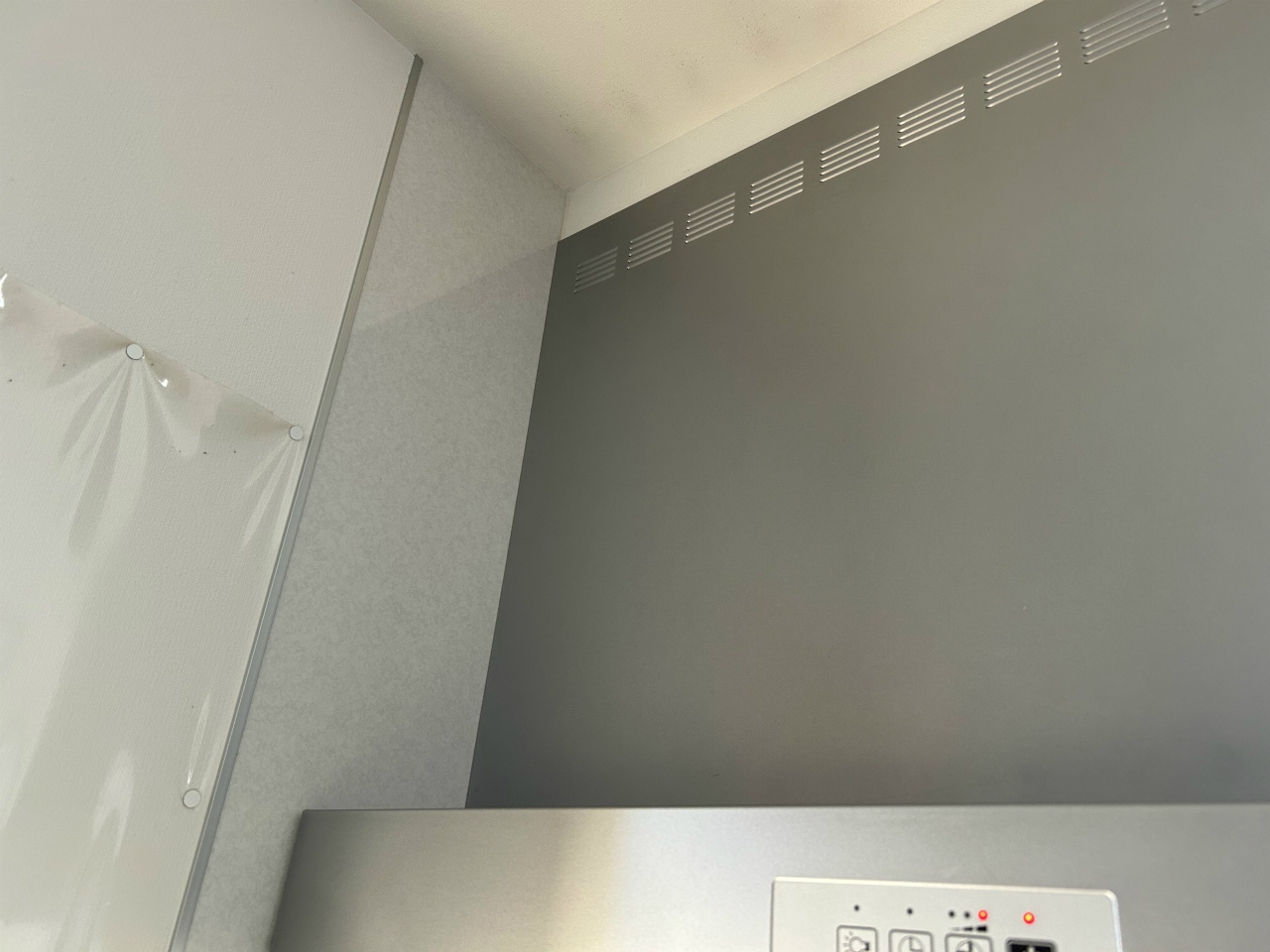 もう一度伺って、幕板を外してみました。Yさんに詳しく様子を聞くと、左側の壁面と幕板の隙間から風を感じるということです。取り付けるときは垂直にはめることを意識しましたが、壁との隙間は意識していませんでした。そこで、幕板をはめ込んでから、壁に押し付けるように力をかけ、その後固定しました。