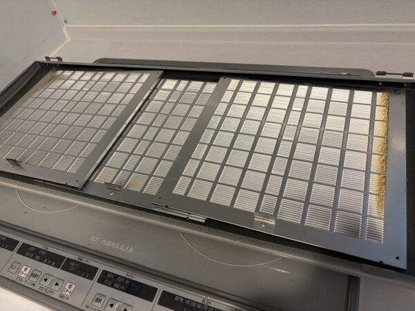 それでも不織布フィルタ―が油分をかなり防いでいたようです。このアルミ製のフィルターが目詰まりするほどだと大変なのですが、油分を感じるのは左右の端っこだけでした。