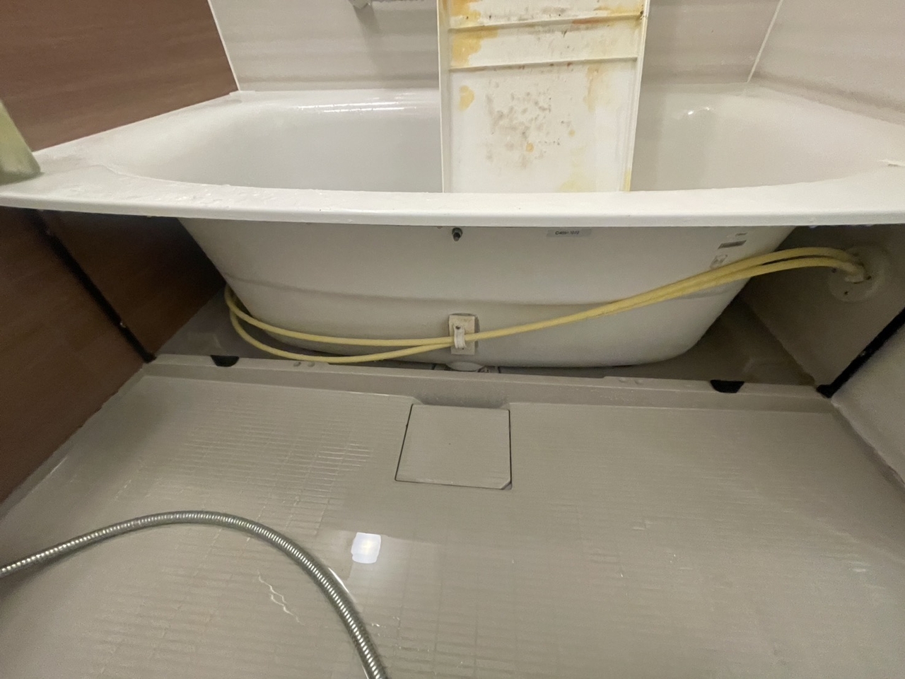 写真を貼付してもらうと、状況が分かりやすいです。レンジフードはタカラ製の分解しやすいタイプです。浴室は正面のアクセントパネルと鏡が白くなっていて、床は石鹸カスを含んだ水あかで褐色の堆積ができています。よく見かける事例です。3時間だと忙しいですが、何とかやってみましょう。