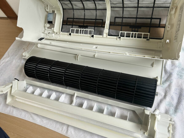 ホコリはらいが終わって最初に取り掛かったのはエアコン。もう1台は新品に交換されていたので、外から見ただけでも汚れを感じるエアコンを見過ごすわけにはいきません。キッチンから離れている部屋なのに、なんでここまで汚れたのだろう?