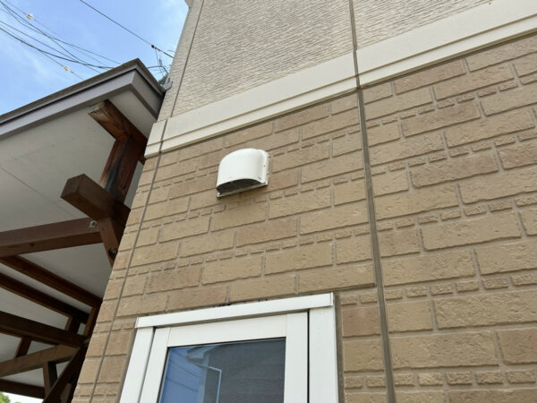 外壁というのは、この換気扇排気口付近の黒ずみです。これは浴室換気扇の分なので、温かい湿気を含んだ排気によってカビ状のものが付着するのでしょうね。ピア+カスイでマッサージすればすぐにきれいになります。