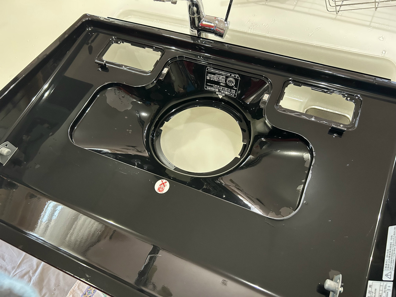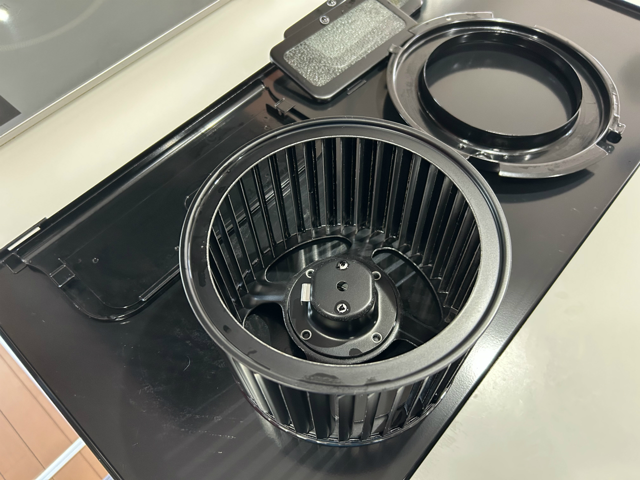 TOTO製のレンジフードは黒光りしています。フィルタ―がない構造です。