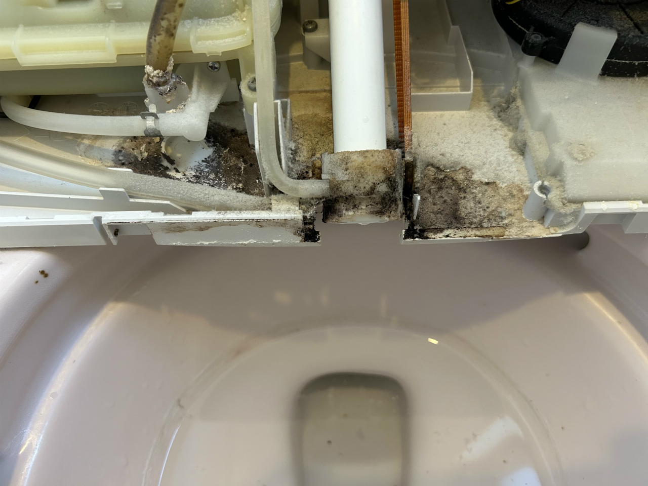 しっかり汚れの上の膜を落してから、2次洗浄に入ります。ゴホゴホと、咳をするように、汚れが出てきます。